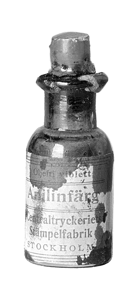 Cylindrisk, med rundad indragen skuldra, grov cylindrisk hals med utstående mynningskant, botten skålig. I halsen en kork. På flaskan en vit etikett, varpå i gredelint: Violett Anilinfärg Centraltryckeriets Stämpelfabrik STOCKHOLM; under bottnen i relief siffran 5. Tillhört inventarierna på Walther von Hallwyls privata kontor, inrymt i Hamngatan 4, Stockholm, 1909 - 1921; därefter på Wilhelmina von Hallwyls, f. Kempe, kontor där från sistnämnda år t. o. m. 1930.
