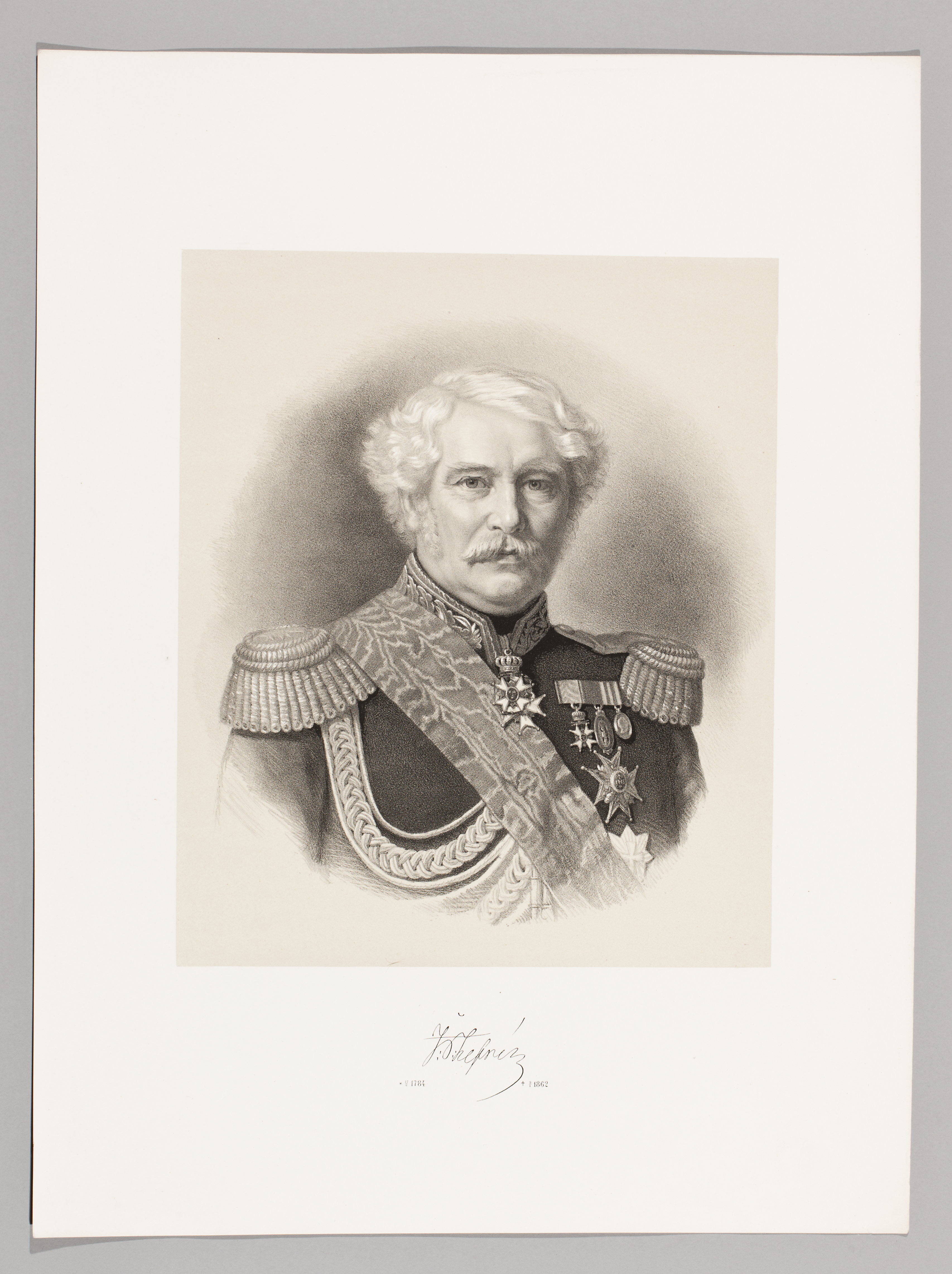 Bröstbild, något åt höger. Klädd i uniform. Ordnar, medaljer, ordensband. Under bilden: "J.P. Lefrén, f 17:2 1784 d 9:1 1862".