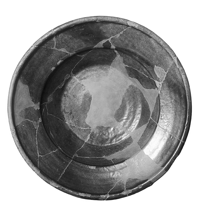KÄRL, skål Av ljusbrunt lergods, blyglaserad i grön på insidan och utsidan. Hopsatt av ett flertal fragment Stympad trattformig insidan avdelad i brätte och kep det förra med uppböjd ytterkant. Höjd: 7 cm Brädd diameter: 32 cm Botten diameter: 17,5 cm