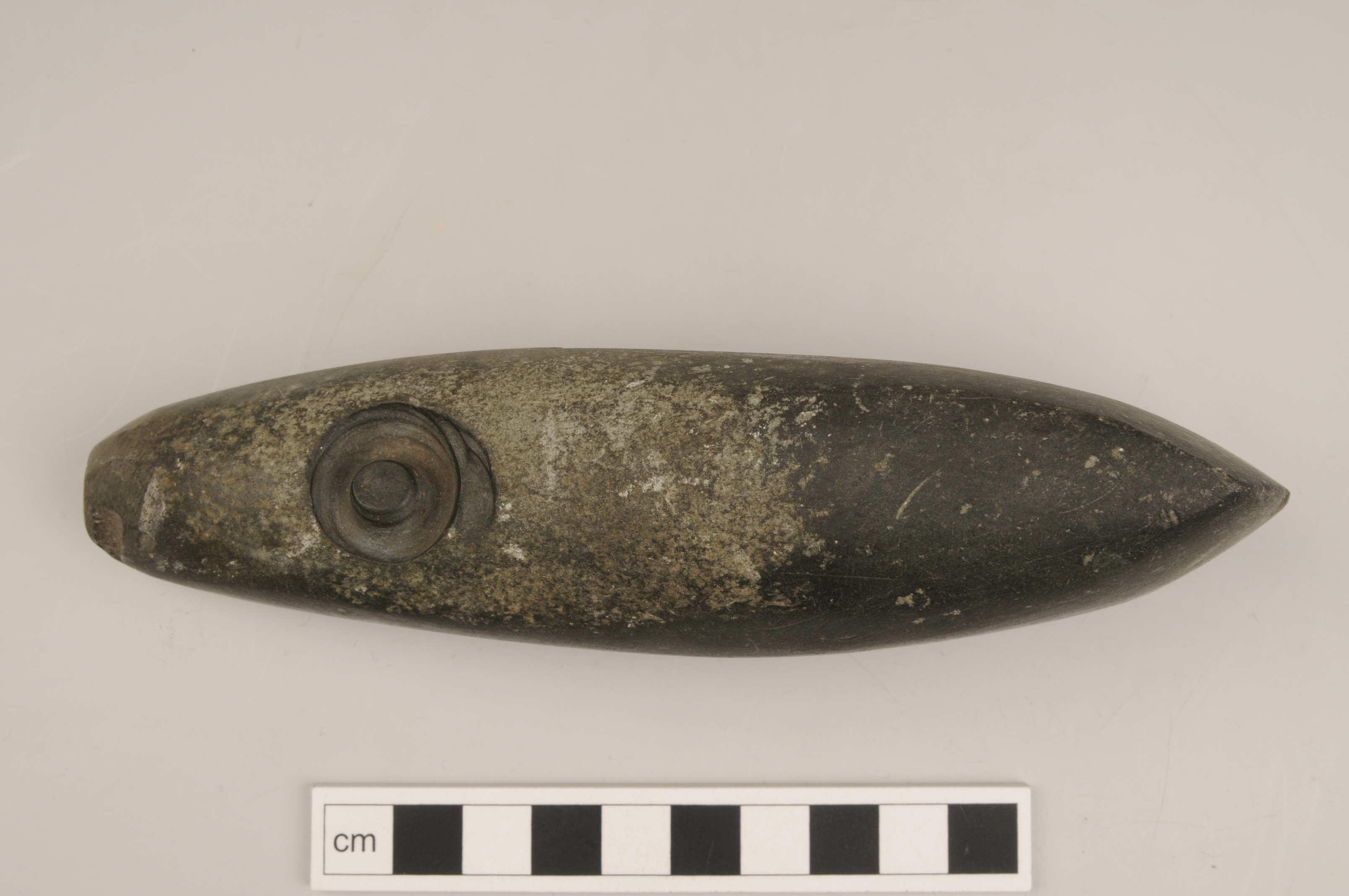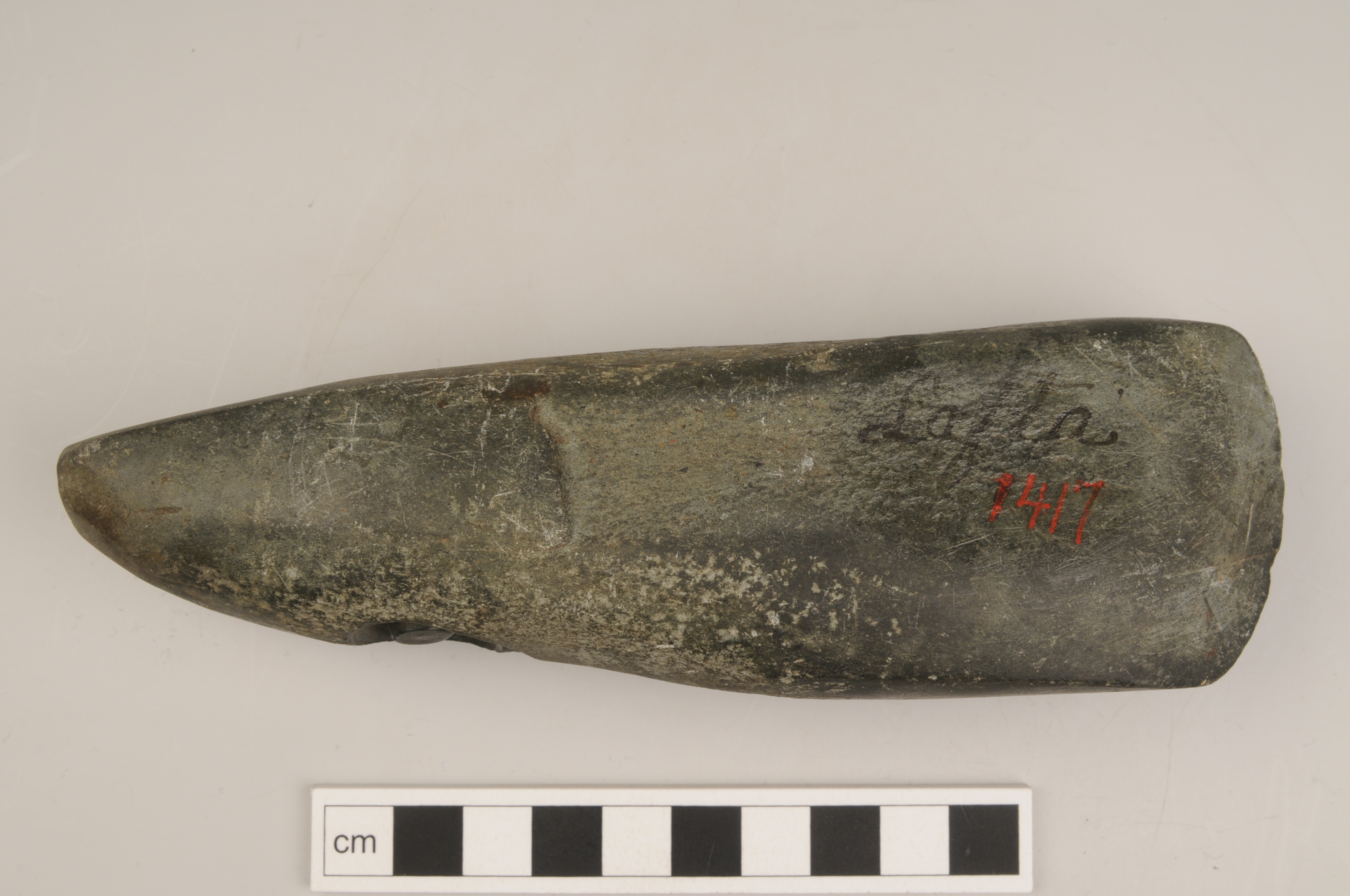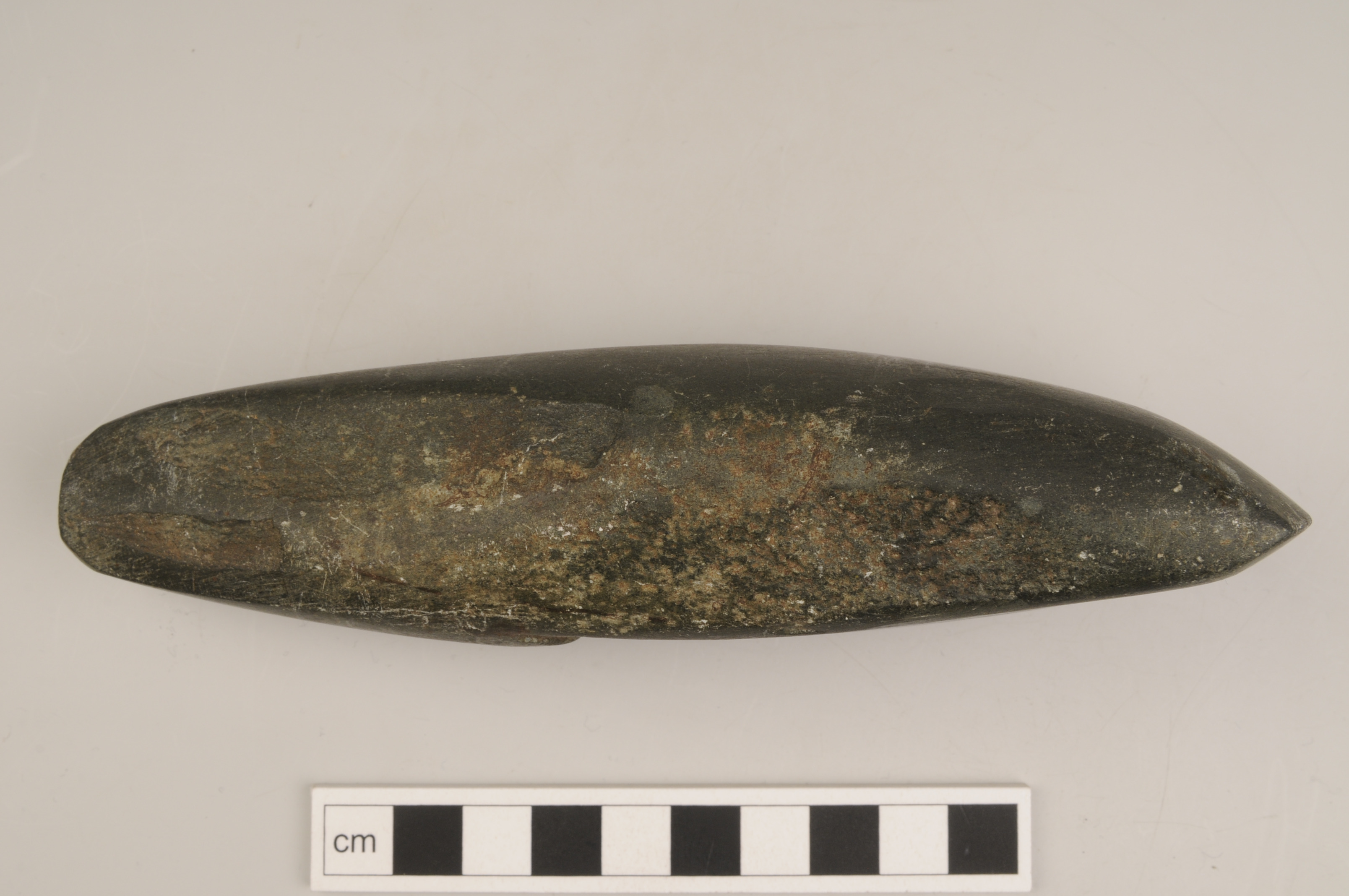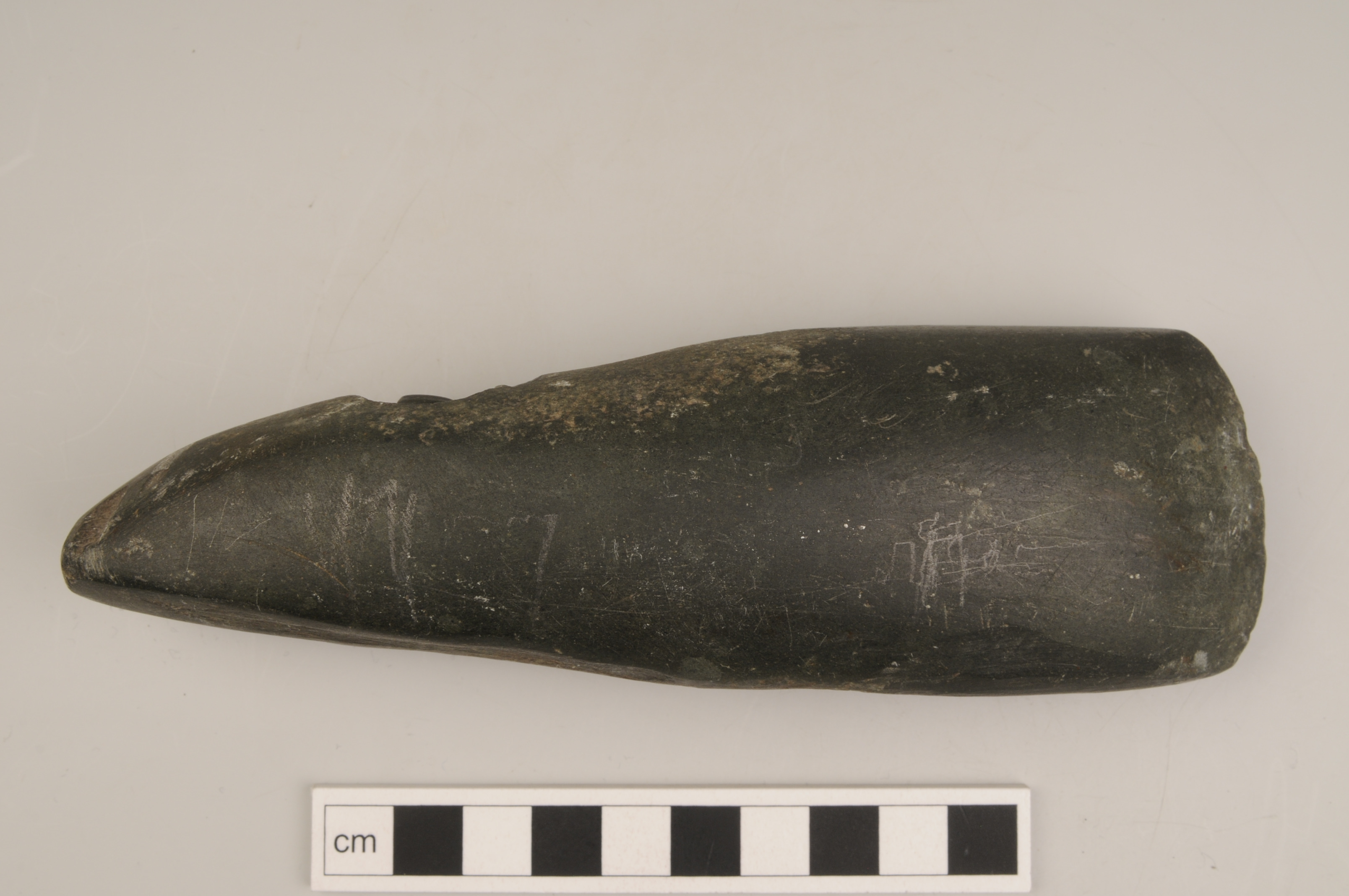 slipad yxa av tät grön bergart. På ena smalsidan finns ett påbörjat skafthål, ca 5 mm djupt, med en uppåtstående pigg.