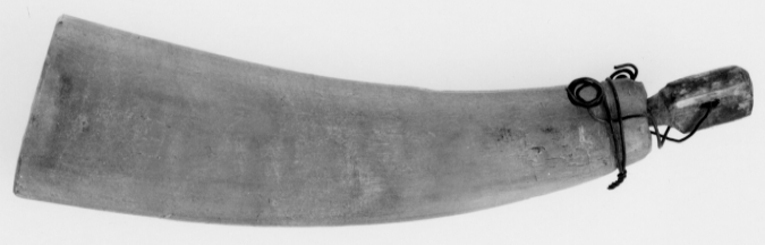 Fängkruthorn av gråvitt, flatpressat, svagt transparant horn. Botten och propp av trä. Proppen fäst vid behållaren med mässingstråd.