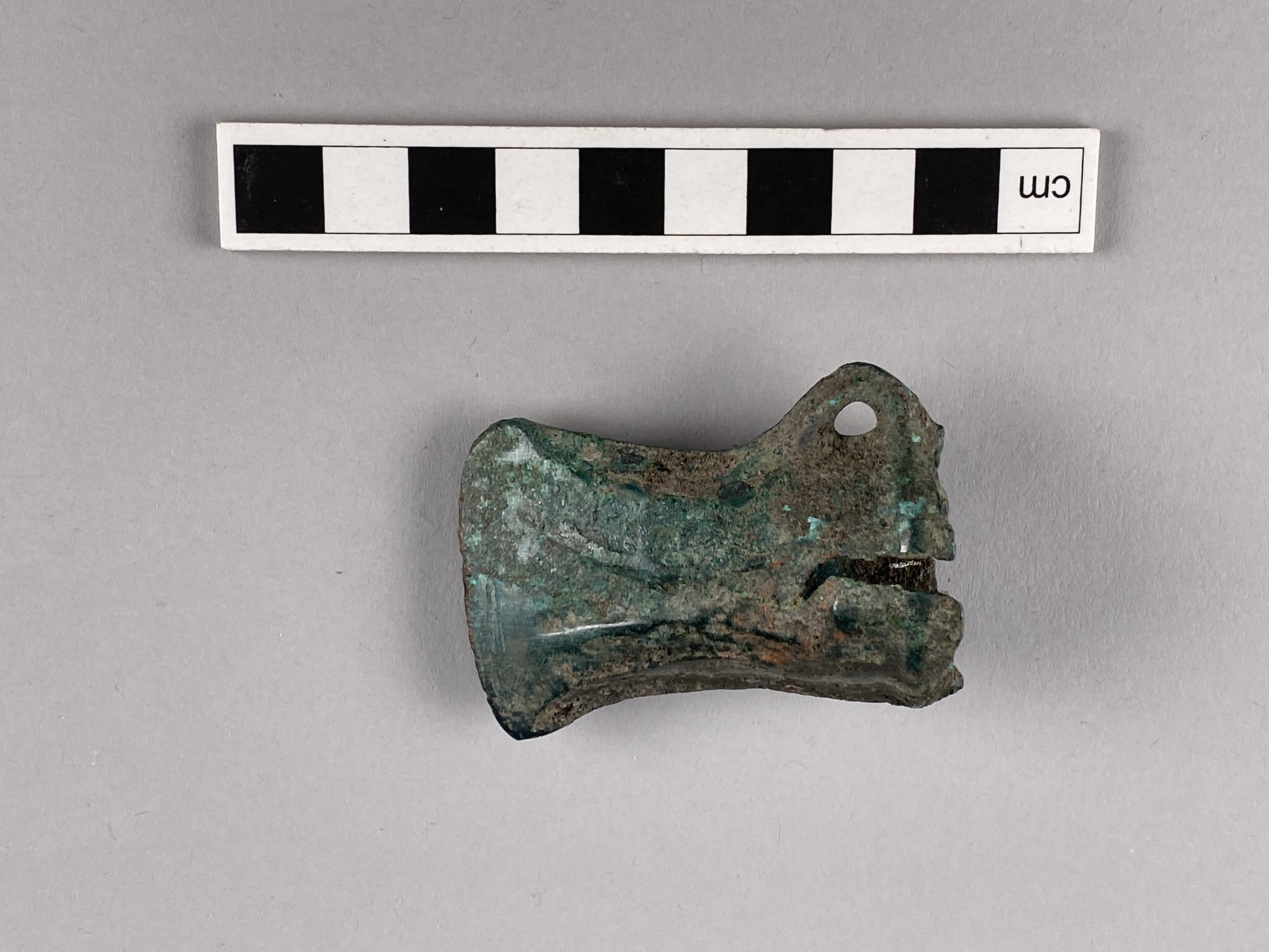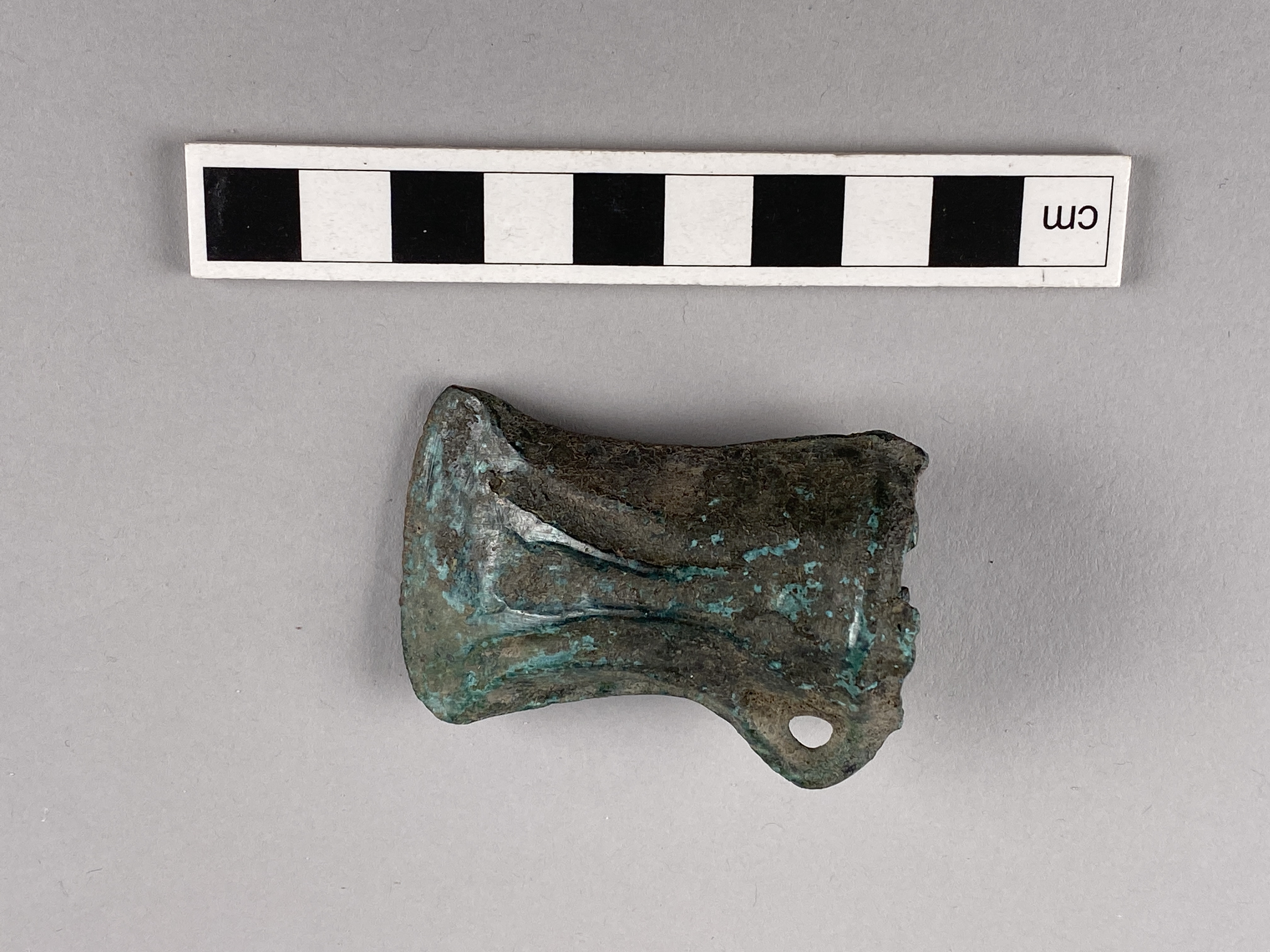 Holkyxa av brons med oval holköppning. Runt denna en ås och en ögla. Kraftiga gjutsömmar på kanterna. Söndrig.