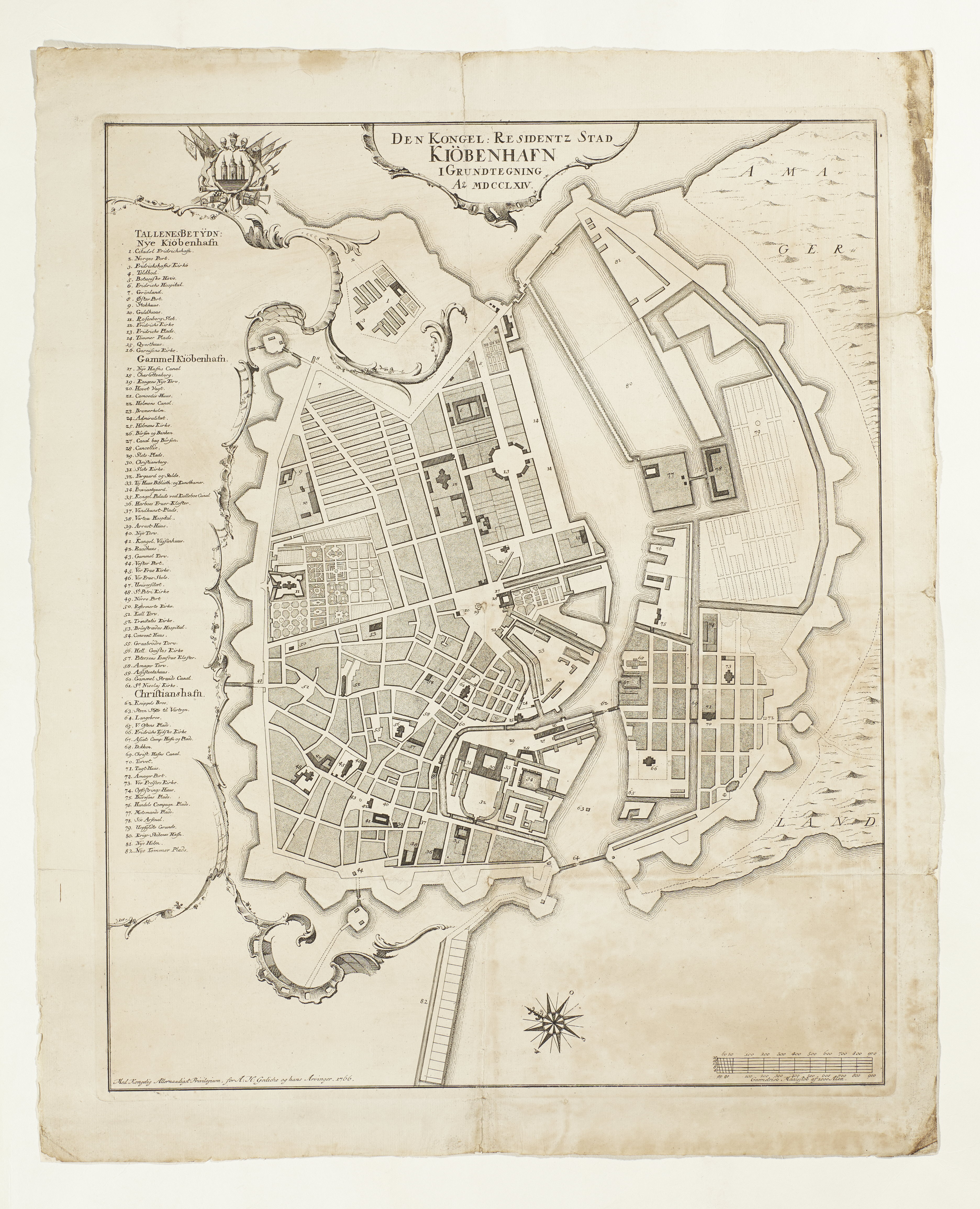I Kartusch vid övre kanten: ”Den Kongel: Residentz Stad Kiöbenhafn i Grundtegning Ao MDCCLXIV” Längst ned t.v. ”Med Kongelig Allernaadigst Privilegium, for A:H: Godiche og hans Arvingar. 1766.” Med bläck på baksidan ”Köpenhamn”.