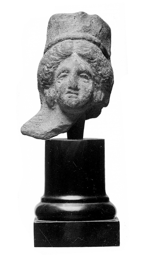 HUVUD (kvinno-) från Girgenti, Sicilien. Av ljusgrått, bränt lergods. Öppna ögon och sluten mun; lockigt hår med mittbena och nedfallande på axlarna, hög huvudbonad, nedtill med ett stafformat band och baktill urholkad; baksidan ej utarbetad. Huvudet från en byst eller statyett; halsen med snett gående brottyta; näsan avnött. Mått: Höjd: 6,4 cm.; bredd, från sidorna: 3,8 cm., framifrån bakåt: 3,2 cm.