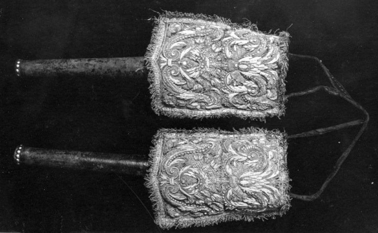2ne Stegläder, broderade med guld, alla perlorne några få undantagne borta, samt försedde med jernsöljor