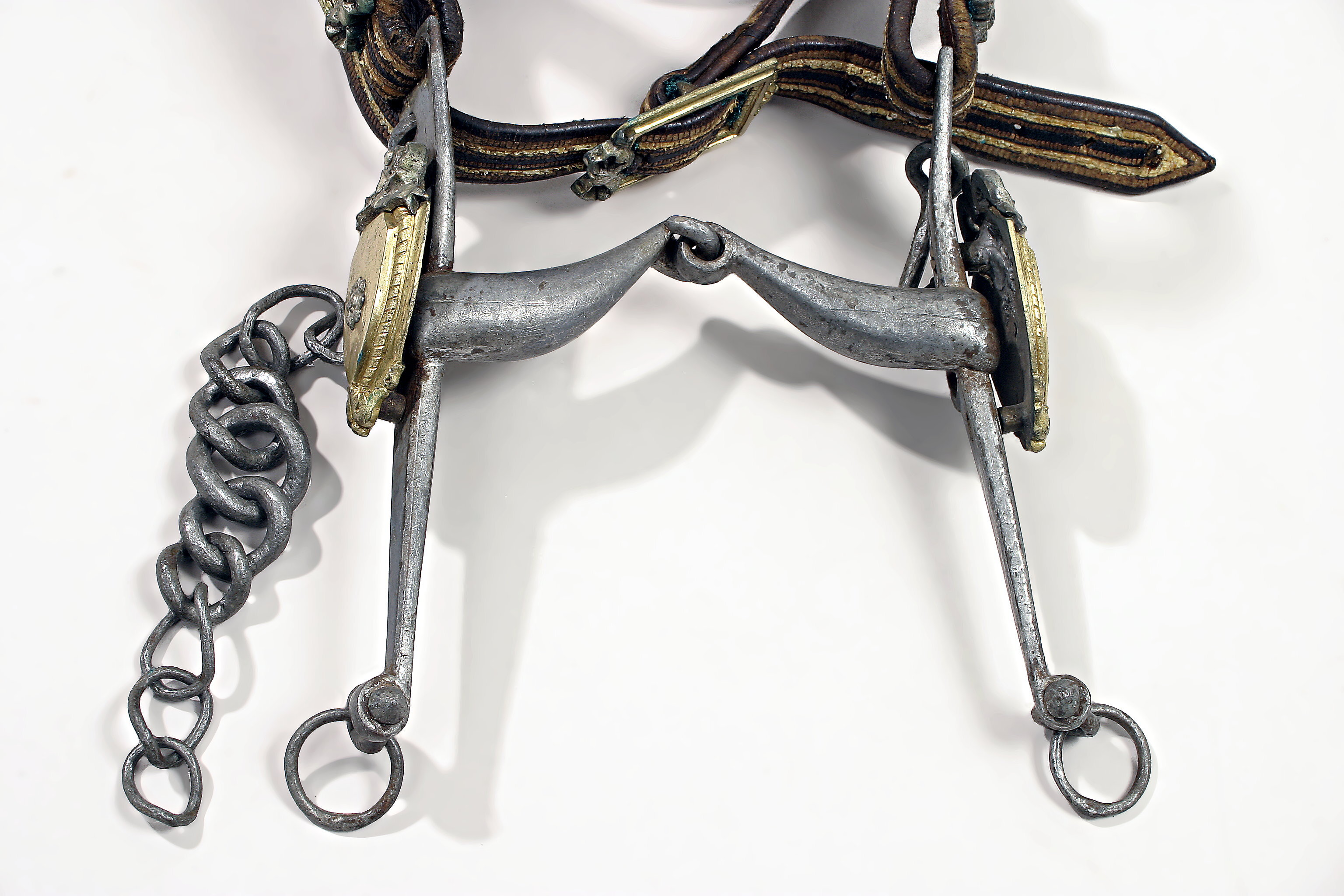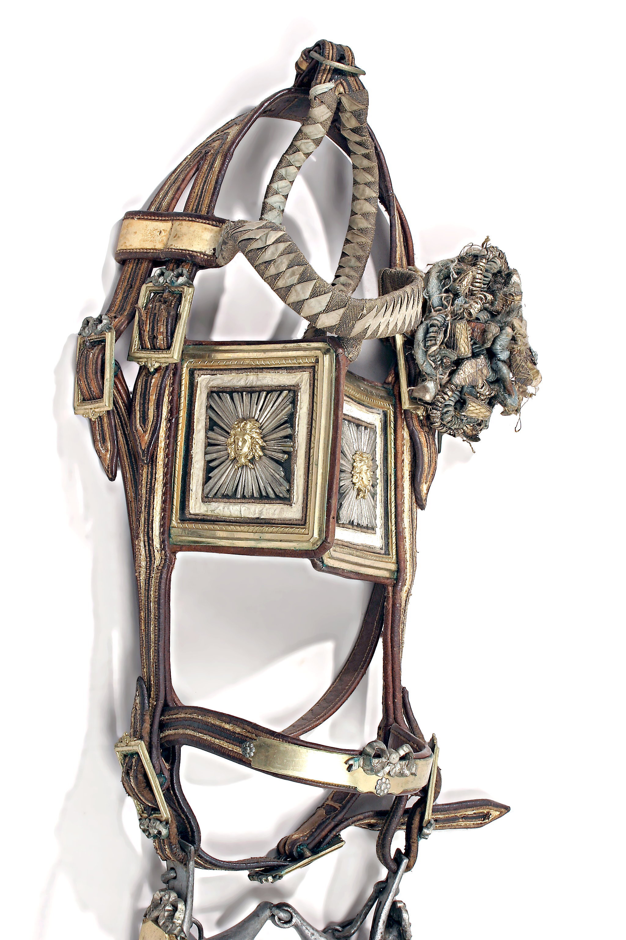 Stångbett av förtent stål med stänger och ledat bett. Sköldformad buckla av gjuten förgylld mässing med försilvrad rosett. Kindkedja av grova länkar. Huvudlag av 23 mm breda bruna remmar med längsgående vita ränder. Nosband med smalt beslag av förgylld mässing med försilvrad rosett och liten blomma. På sidostyckena rektangulära skygglappar 123 x 115 mm med profilerade ramar och i mitten medusahuvud av förgylld gjuten mässing. Huvudet omgivet av försilvrade strålar på läderplatta omgiven av vitfärgad kant. Pannrem och stjärnrem lindad korsvis med guldband och ljusblå, numera blekta sidenband. Sidostycken övergående i nackrem, tvådelad. Den bakre delen fäst vid käkrem. Sammanlagt sex söljor av förgylld mässing, rektangulära med försilvrad rosett. Stjärnremmen fäst med enkel mässingssölja. På vänstra sidan vid pannremmen stjärna i form av runduddad kokard av blått silke, guldtråd och guldfolie (frans saknas).