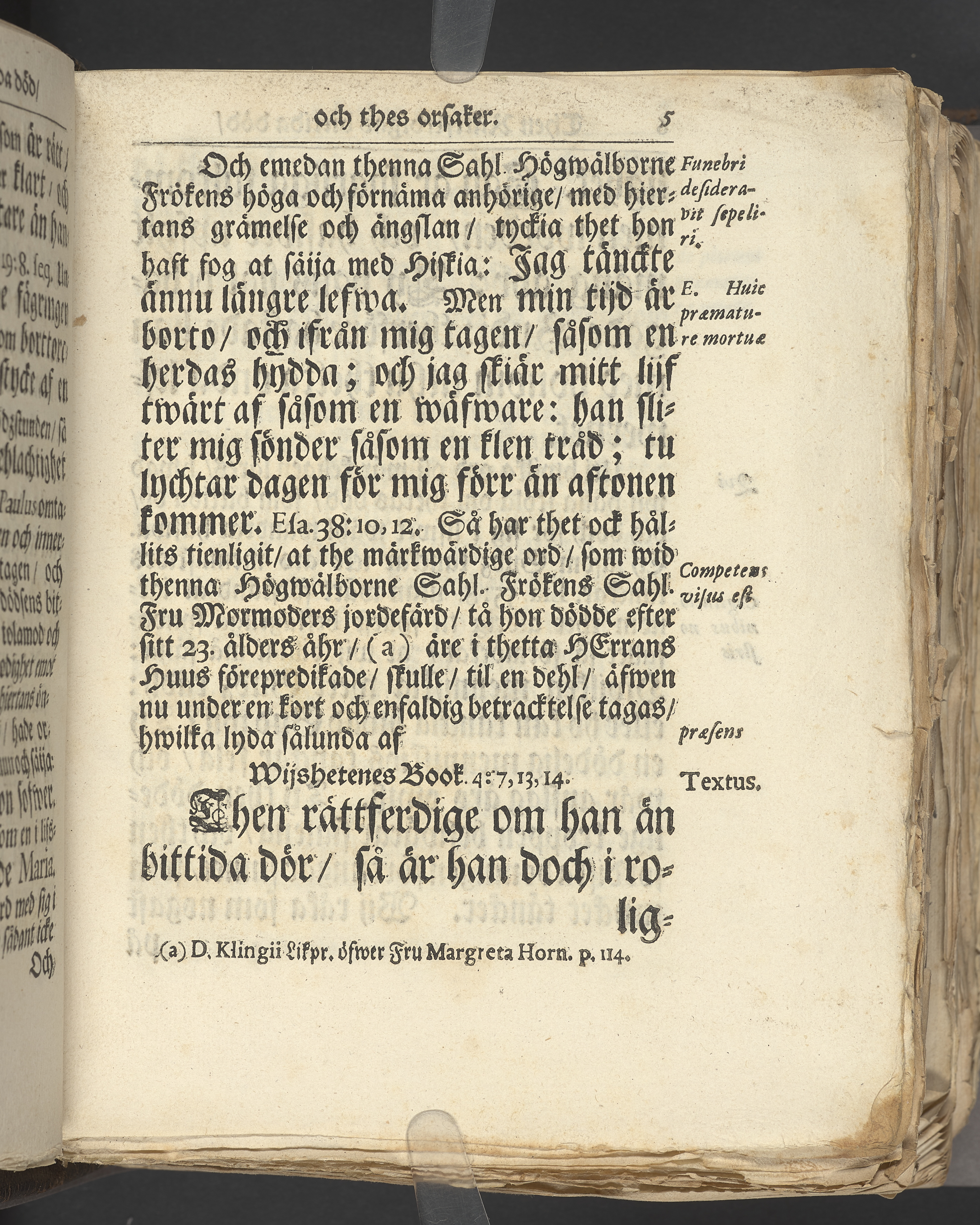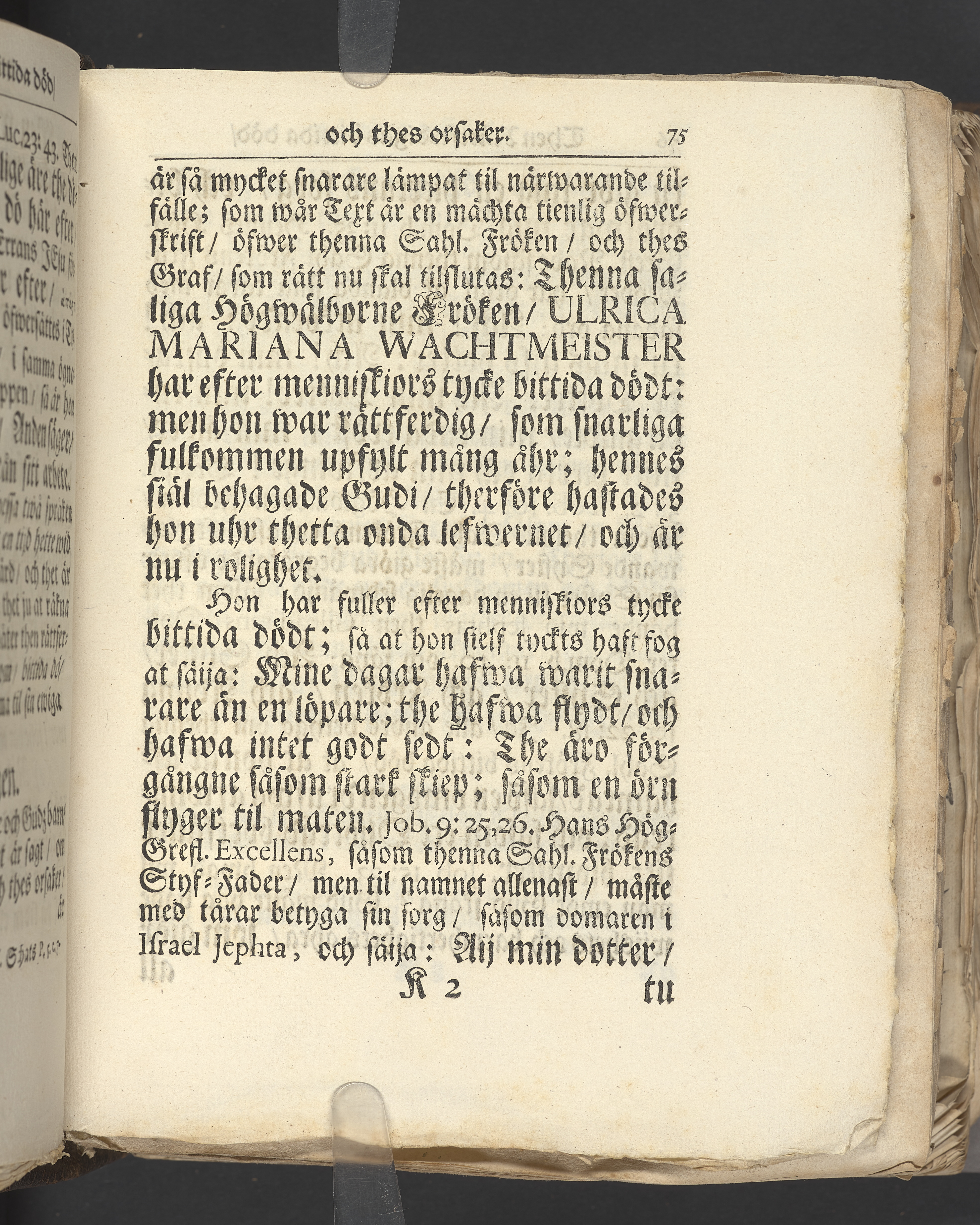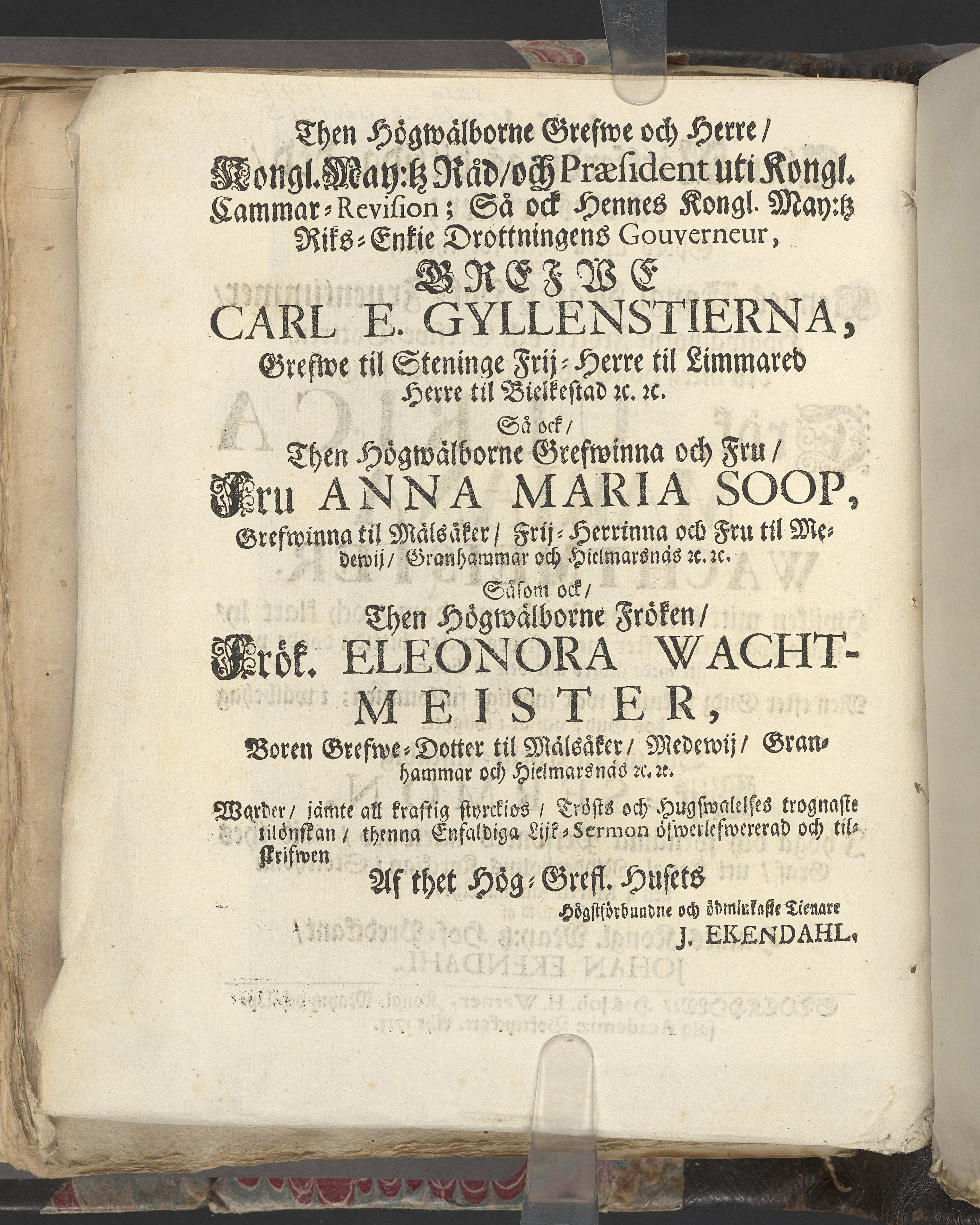 Then rättferdigas bittida död, och thes orsaker; spord uppå then för thetta, af hennes kongl. may:tz hof-fruentimmer ... nu mera hos Gud ewinnerligen saliga: frök. Ulrica Mariana Wachtmeister. Hwilken mitt i sin blomstrande ungdom, och klart lysande dygdeprof, efter menniskiors tycke, bittida dödde på sitt 19:de ålders åhr den 28 febr. 1713. Men efter Gudz räkning, war snarliga fulkommen; i wälbehag hos Gud; och är i rolighet. Och uti en christ-enfaldig lijk-sermon, i höga och förnäma personers närwaro, wid thes graf, uti kongl. Ridderholms kyrckian i Stockholm den 4 martii samma åhr, förestäld af ... Johan Ekendahl. Stockholm, hos Joh. H. Werner, kongl. may:tz och Upsala academiae boktryckare. Åhr 1713.