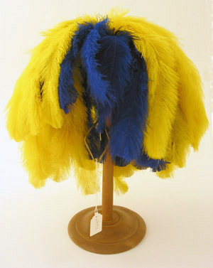 Plym av blåa och gula strutsfjädrar sammanfästade vid en dubbel mässingstråd, vinkelformigt böjd och delvis överklädd med svart skinn.
