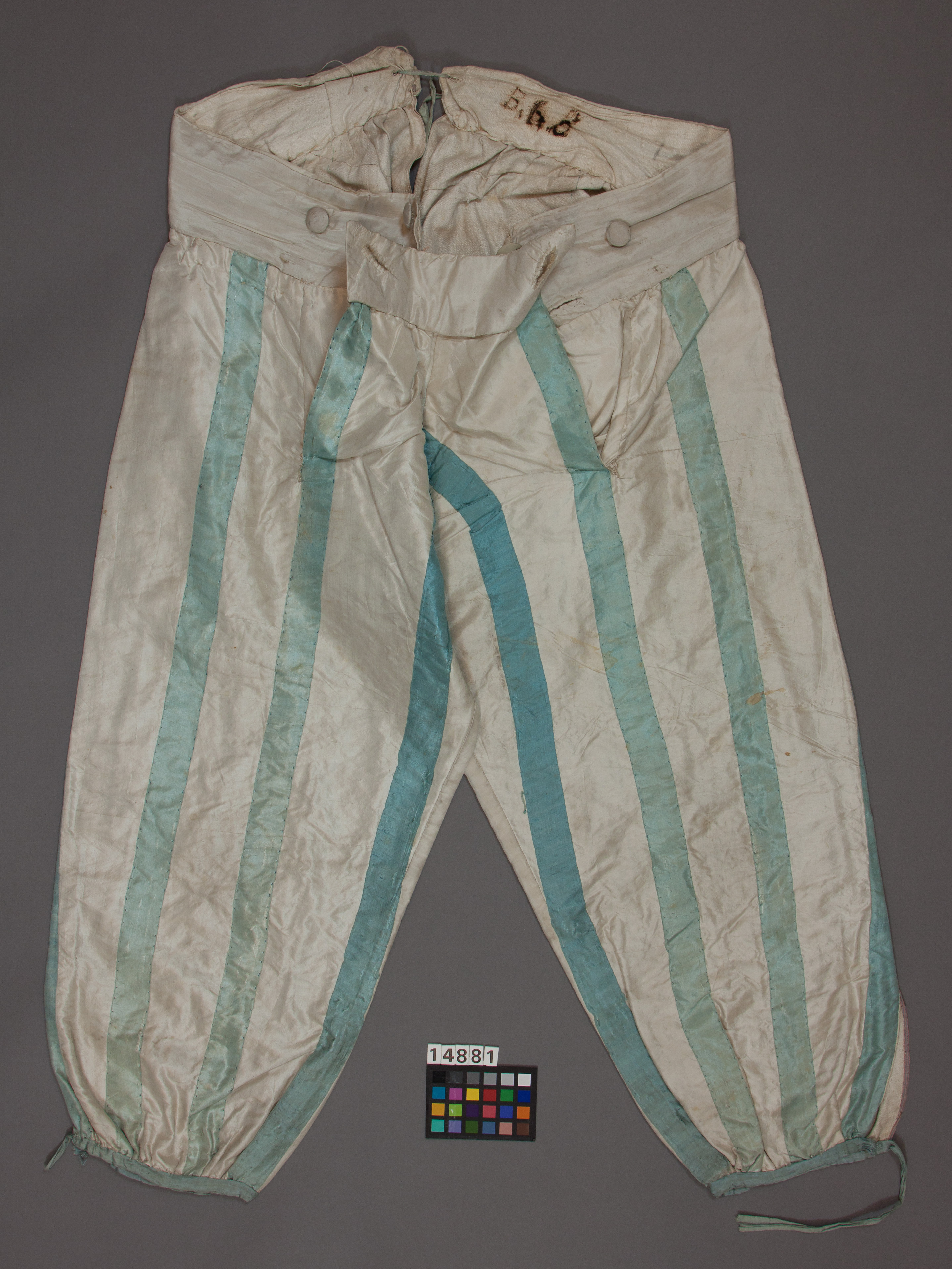 Knäbyxor av vit taft med påsydda glest lagda ljusblå sidenband, bredd 30 mm. I höger sida ficka. I linningen skrivet: "B ? 8 ". Dräkten är tillsammans med gnr 17/46-17/192 en gåva av H.M. Konungen (Gustaf V) genom chefen för Kungl. Husgerådskammaren 1917.