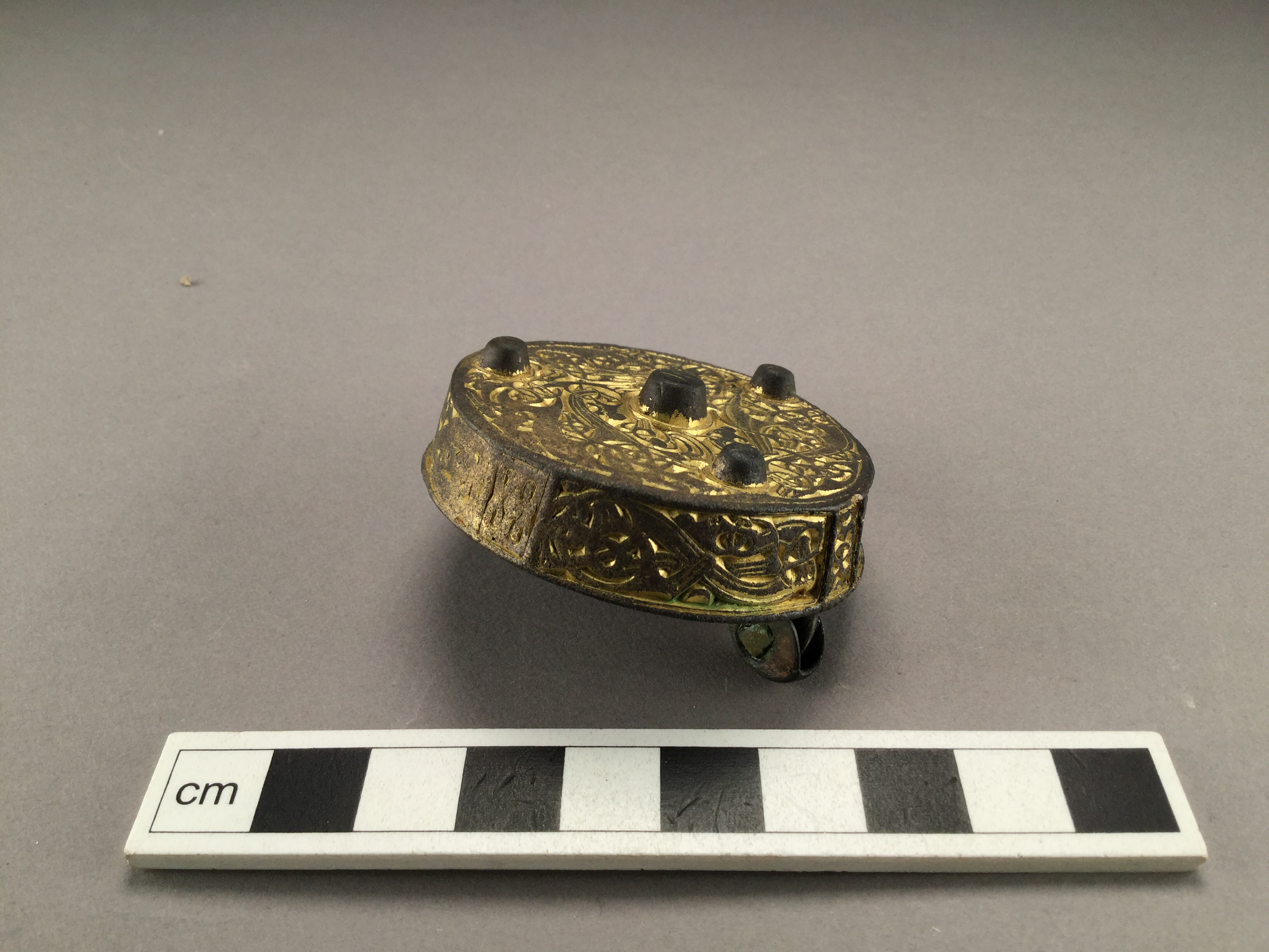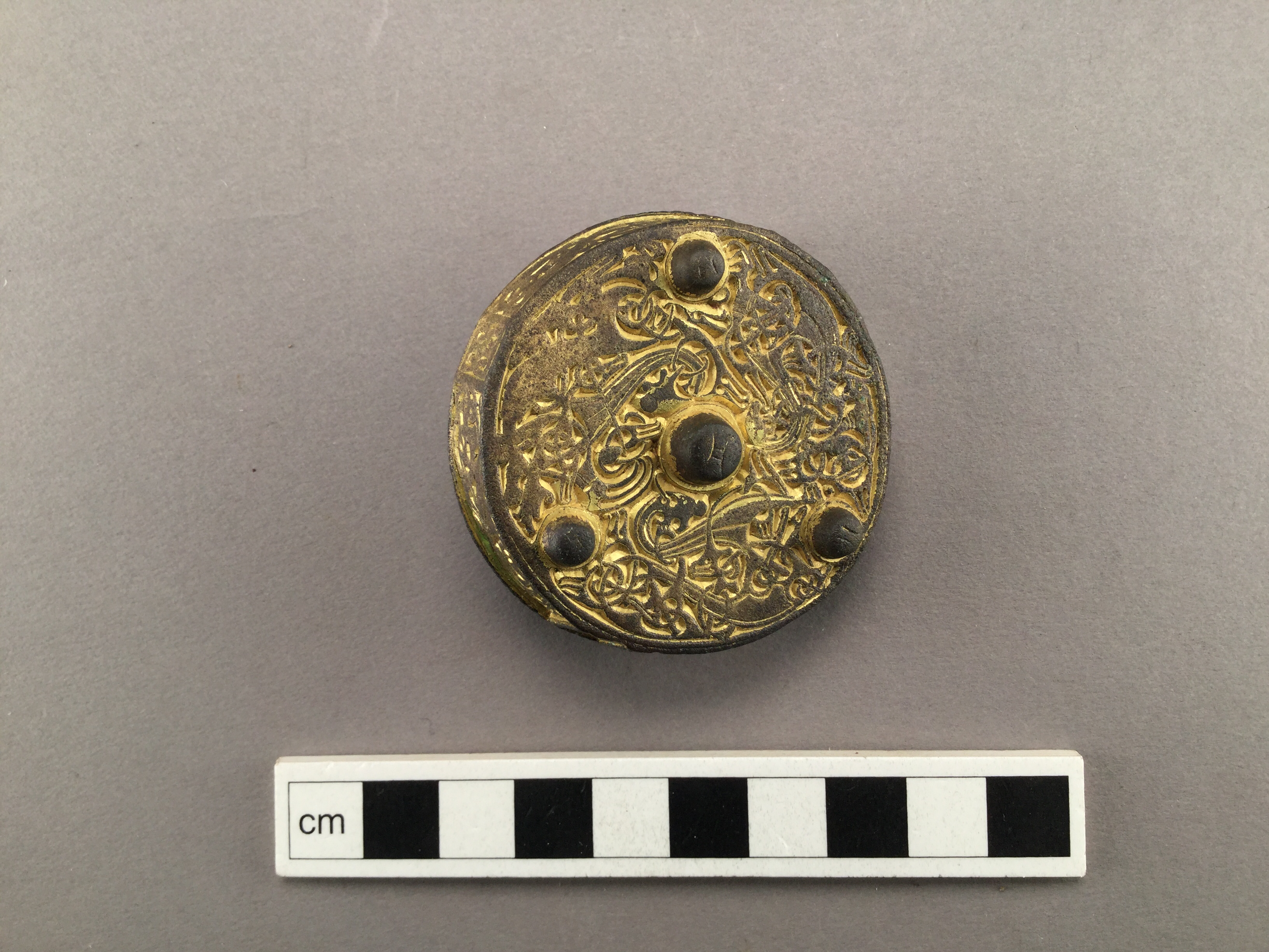 runt, dosformat spänne med rik dekor i broastil. förgyllning på översidan. en mittknopp och tre sidoknoppar på översidan. Nålkonstruktion på undersidan.
