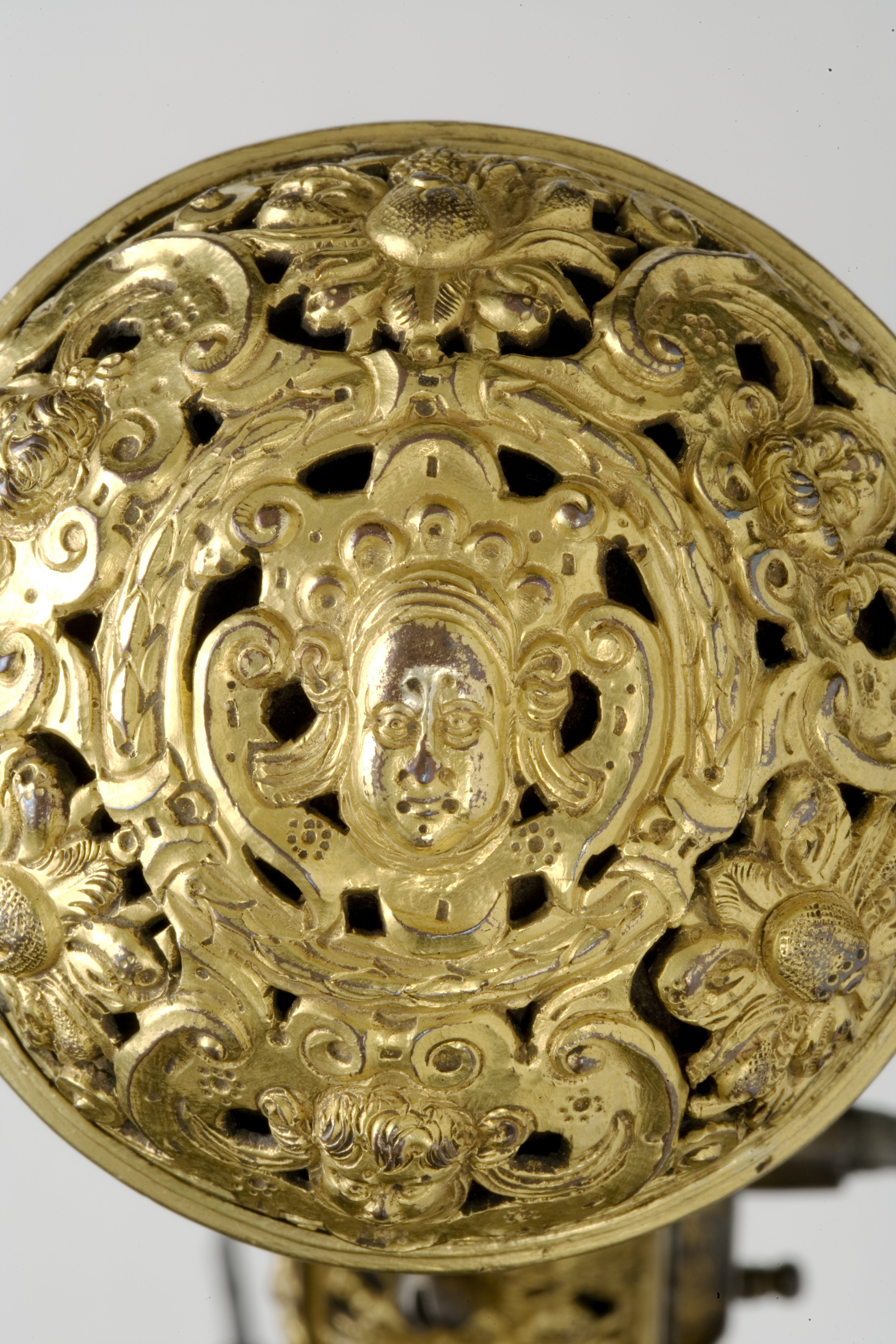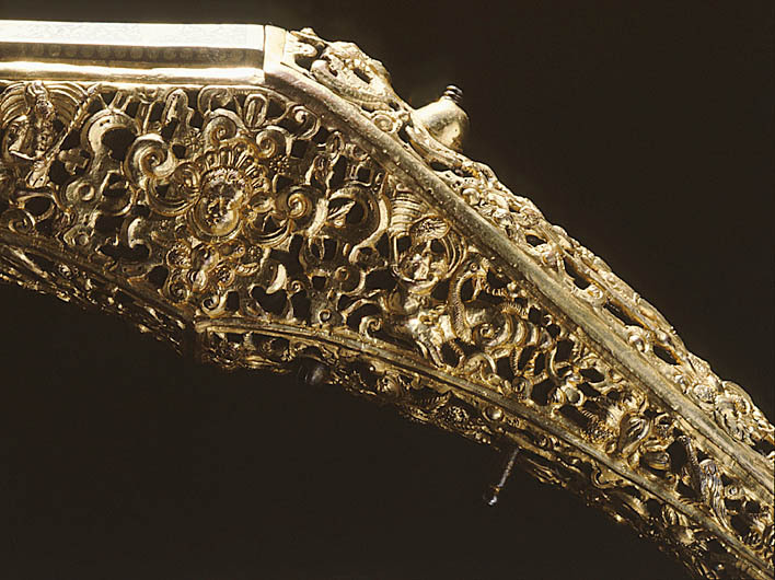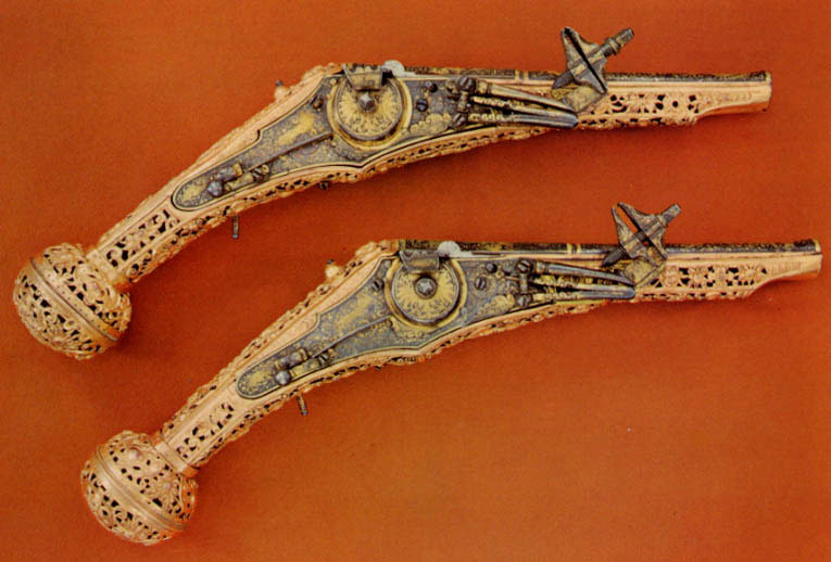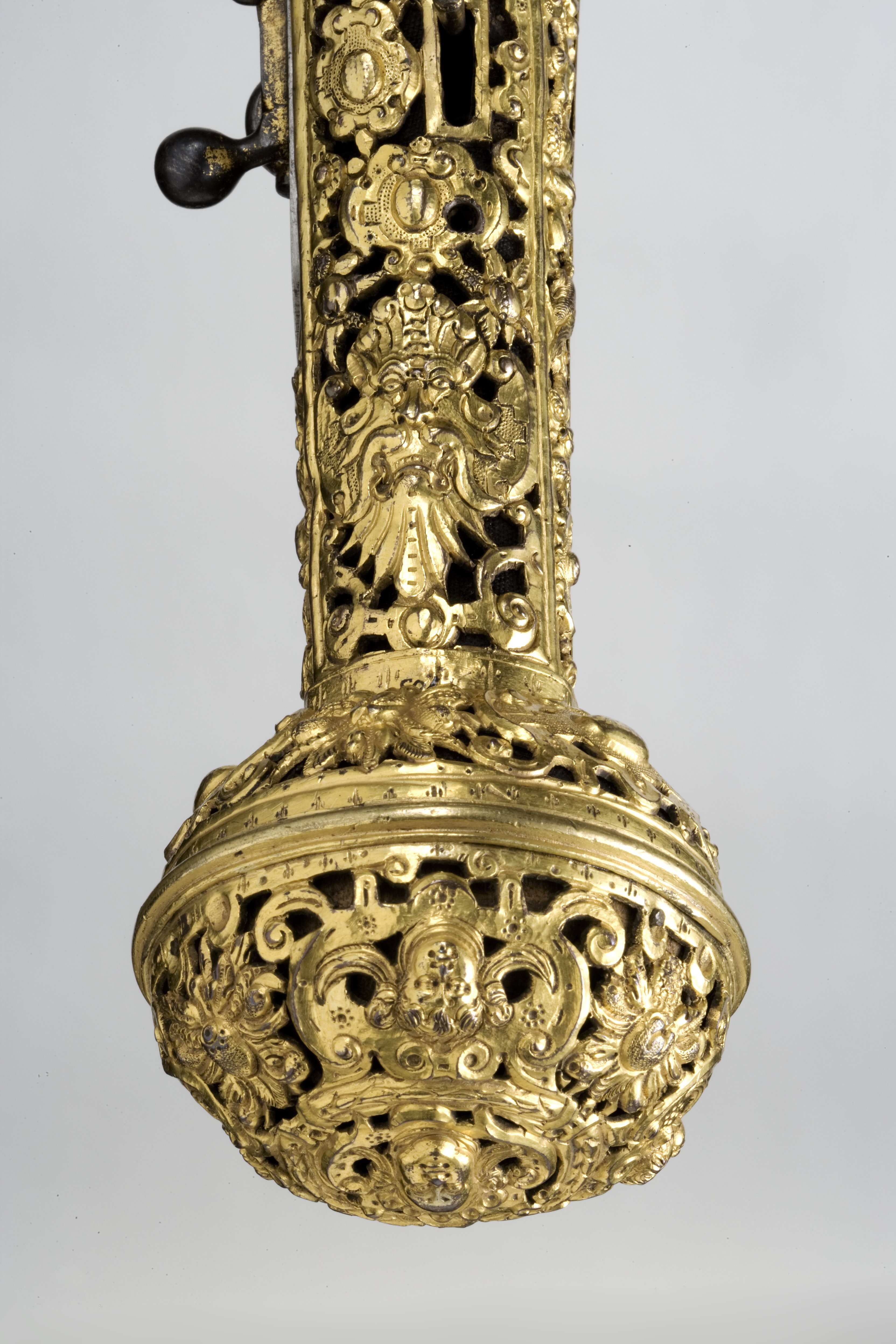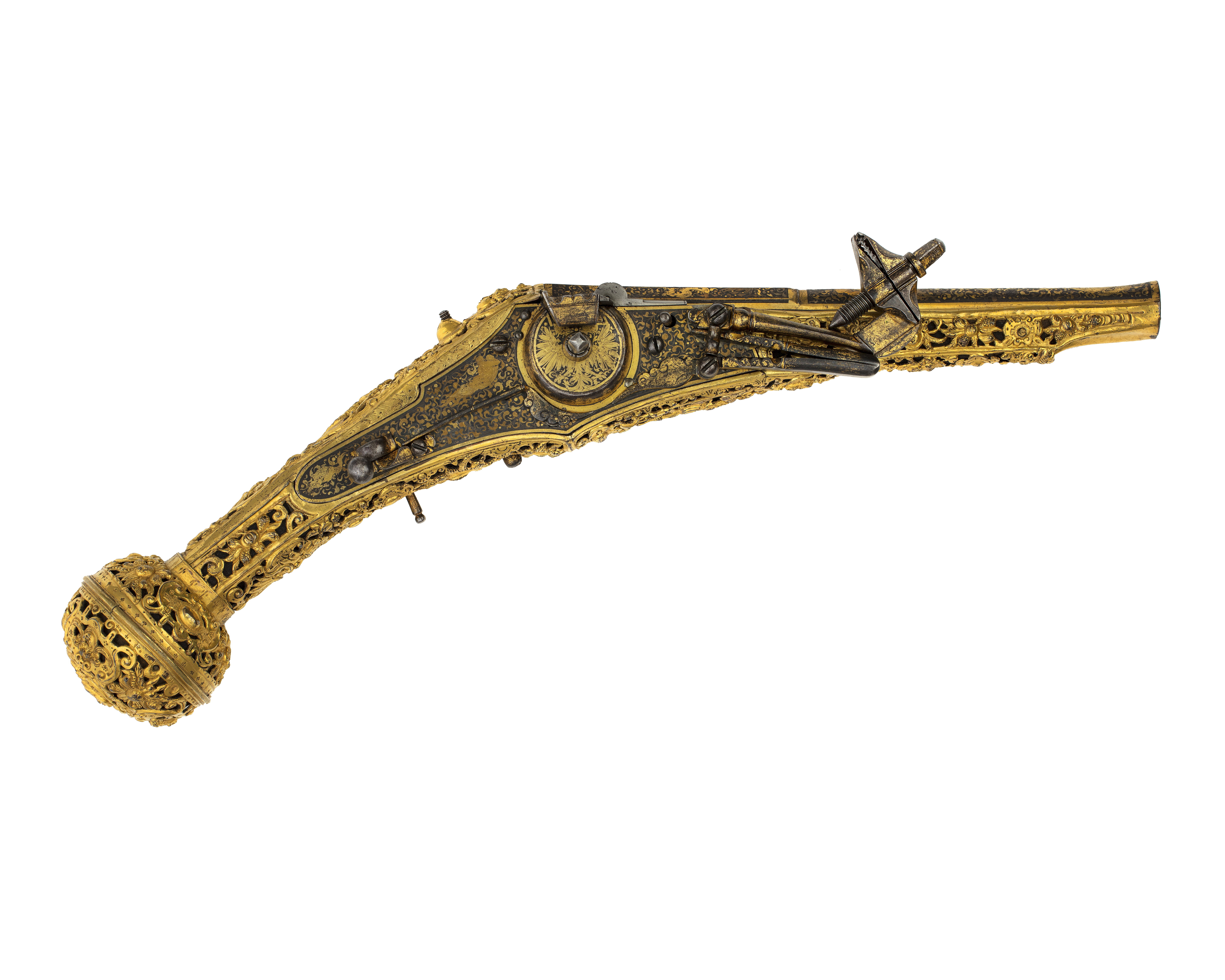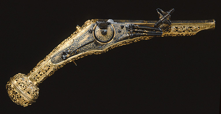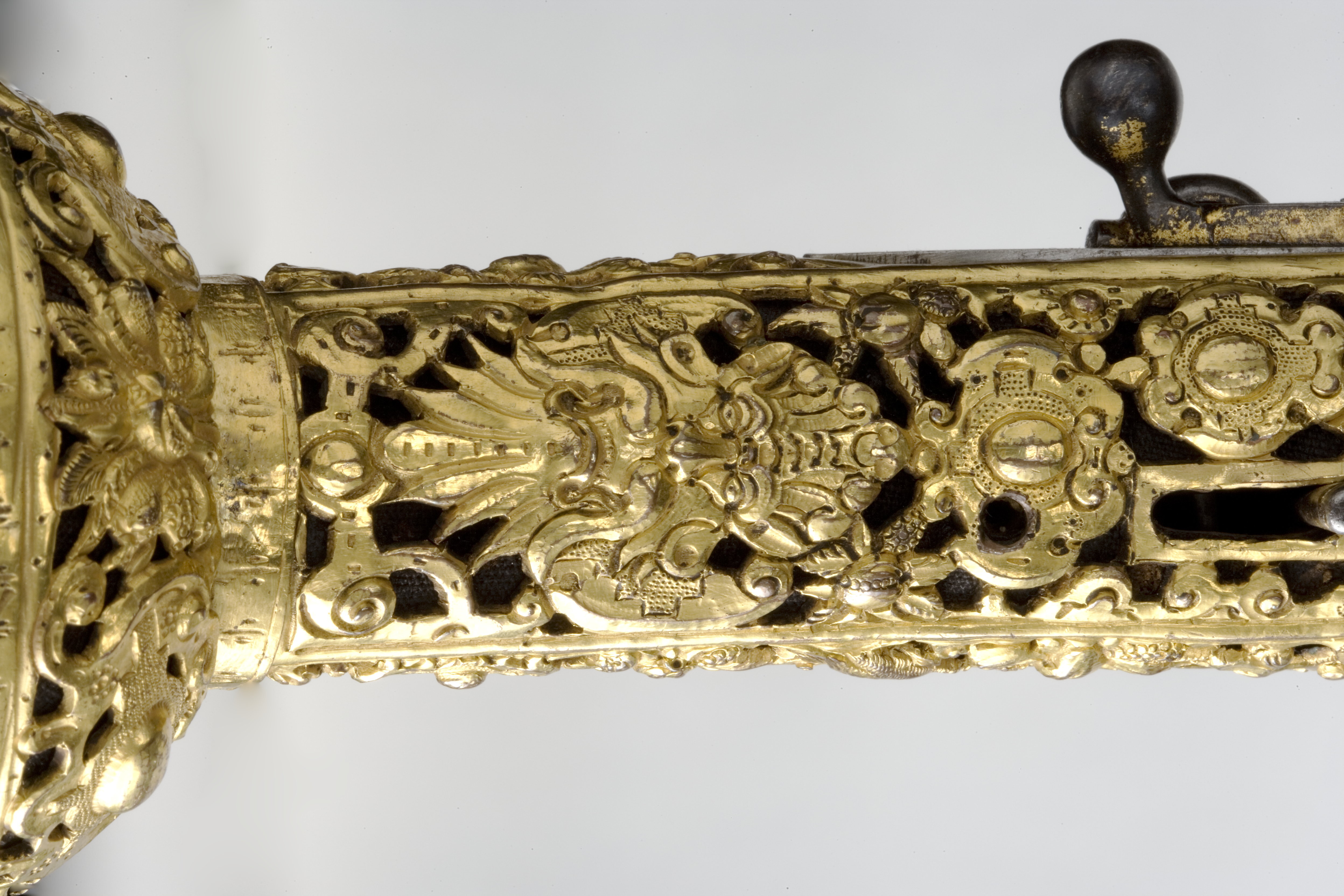 Rund, slätborrad, blånerad pipa med åttsidig kammare och trumf. Pipans ovansida försedd med yttäckande ornering av påslaget guld i form av rankor inom förgylld ram, i rankverket på kammaren en uggla, trofégrupp med amasonsköld och svärd samt fågel, på pipans runda del en halvliggande man och kvinna med krus ur vilket vatten rinner samt däremellan fågel. I vinkel böjt svansskruvblad, placerat något lägre än pipans översida. På kammarens undersida en djupt inslagen stämpel liknande en treklöver. Fästning: Två häften. Pipan fäst med krysskruv underifrån samt två pipstift av mässing. Hjullås av tysk typ med plant, på utsidan blånerat låsbleck med förgylld kant. Yttäckande dekor av påslaget guld i form av rankverk samt bakom hjulet en halvliggande människofigur, bakom säkringen en drake, förgylld kant. Hjul täckt av plan kapsel med påslagen dekor i form av dubbelörn. Fängpanna med förgylld gavel, blankt fängpannelock med rörlig arm, rundat grepp, på låsbleckets kant därunder guldkant och påslagna, rundad plattor. Svarvad, förgylld tryckknapp. Förgylld hane med lång, rundad kropp med ås på utsidan, balusterformig nedre del, hals med svängd framkant. Rektangulära käkar med runda fasningar framför och bakom käkskruven, underkäken lös, käkskruv med kantigt huvud. Förgylld hanfjäder med delvis rundade kanter, bakre delen i form av blad, balsuterformig studel, långt fjäderlöv. Invändiga låsdelar blanka. Säkring: Förgylld virvelsäkring med knoppformigt grepp, fjäder med blad svängt efter hjulets rundning. Fästning: Två låsskruvar från h. sida. Avtryckare: Svarvad, förgylld avtryckare. Stock av trä med i vinkel mot pipan böjd, bakåt avsmalnande kolv med stor, rund kolvkula, d: ca 81 mm, hca 66 mm. Stocken helt täckt av genombrutet, förgyllt kopparbleck i fyra delar över kolvrygg, resten av stocken samt två halvor på kolvkulan. Reliefdekor i beslagsornamentik med blad och frukter, kartuscher, maskaroner och människoansikten, på v. sida två mot varandra vända, tritonliknande figurer med fanor, flankerande kartusch med människoansikte. På kolvens undersida en stående krigare i antikiserande rustning, i ena handen en lans, i den andra en sköld, samma figur finns på blecket på kolvryggen. Blecket framdraget över svansskruvbladet. Kraftigt välvt fäste för krysskruven. På kolvkulan finns en profilerad vulst.