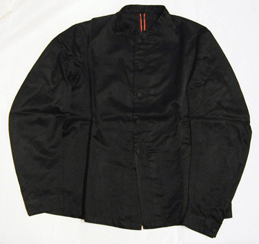 Blus av svart siden, enkelknäppt, fem knappar, d: 15 mm, överklädda med blusens tyg. Låg ståndkrage. Nedtill på ärmarna ett 80 cm långt sprund knäppt med en knapp. Blusen ofodrad, i mittsömmen bak synlig röd- och vitrandig stadkant.