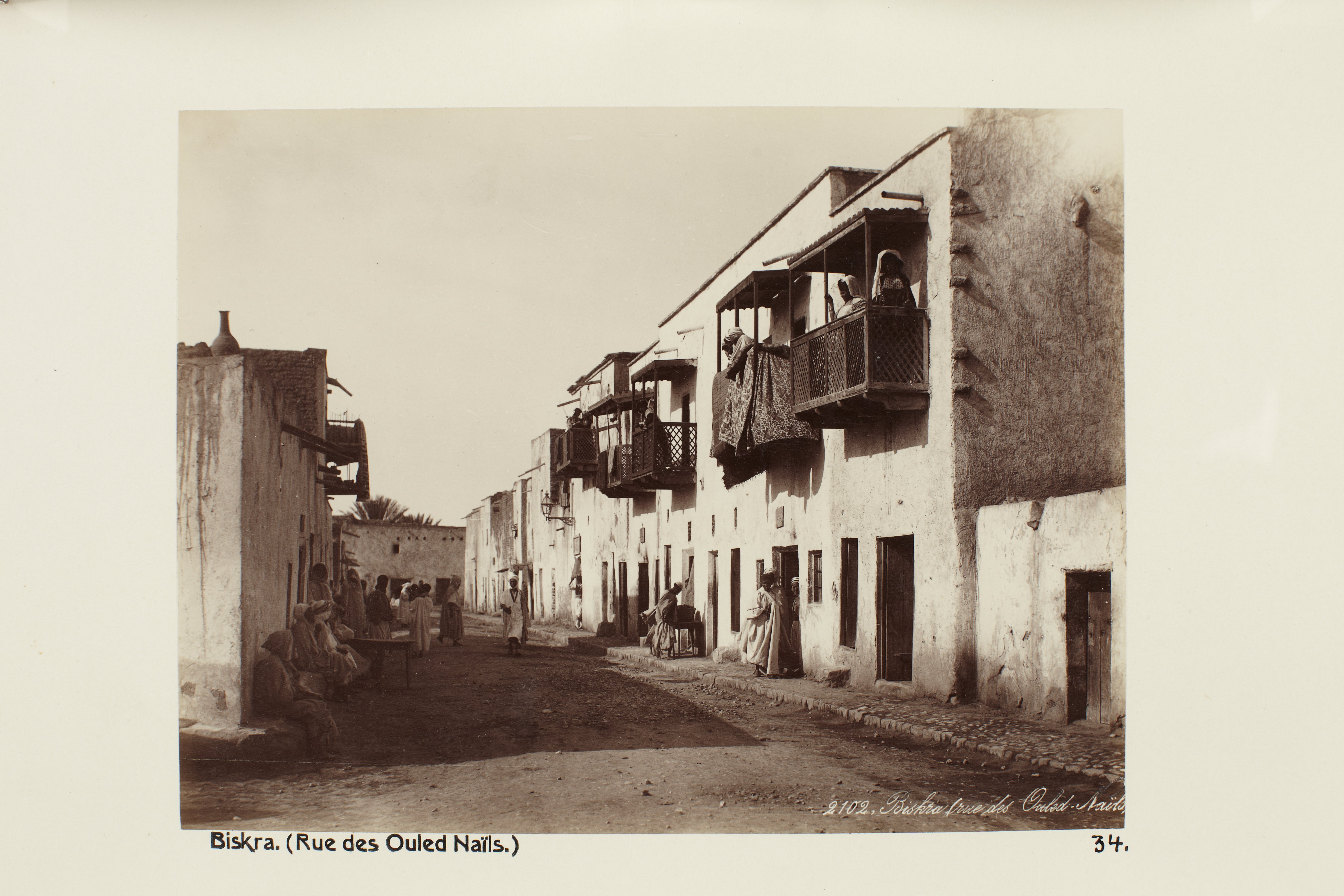 BISKRA, Algeriet. Rue des Ouled-Naïls. Foto från resa genom Algeriet och Tunisien samt åter över Schweiz, 11 februari - 19 maj 1889. Samtliga foton i gruppen LXVI:F. är inköpta av Wilhelmina von Hallwyl i Alger, Biskra, Tunis, Constantine, Oran och Blidah vid hennes vistelse i nämnda städer tillsammans med sin make, Walther von Hallwyl, sin mor, Johanna Kempe, f. Wallis, dottern Irma samt fröknarna Caroline Pflaum och Ida Uhse. Uppgifterna kommer från fröken Ida Uhses reseanteckningar.