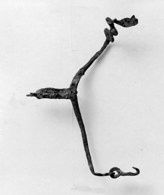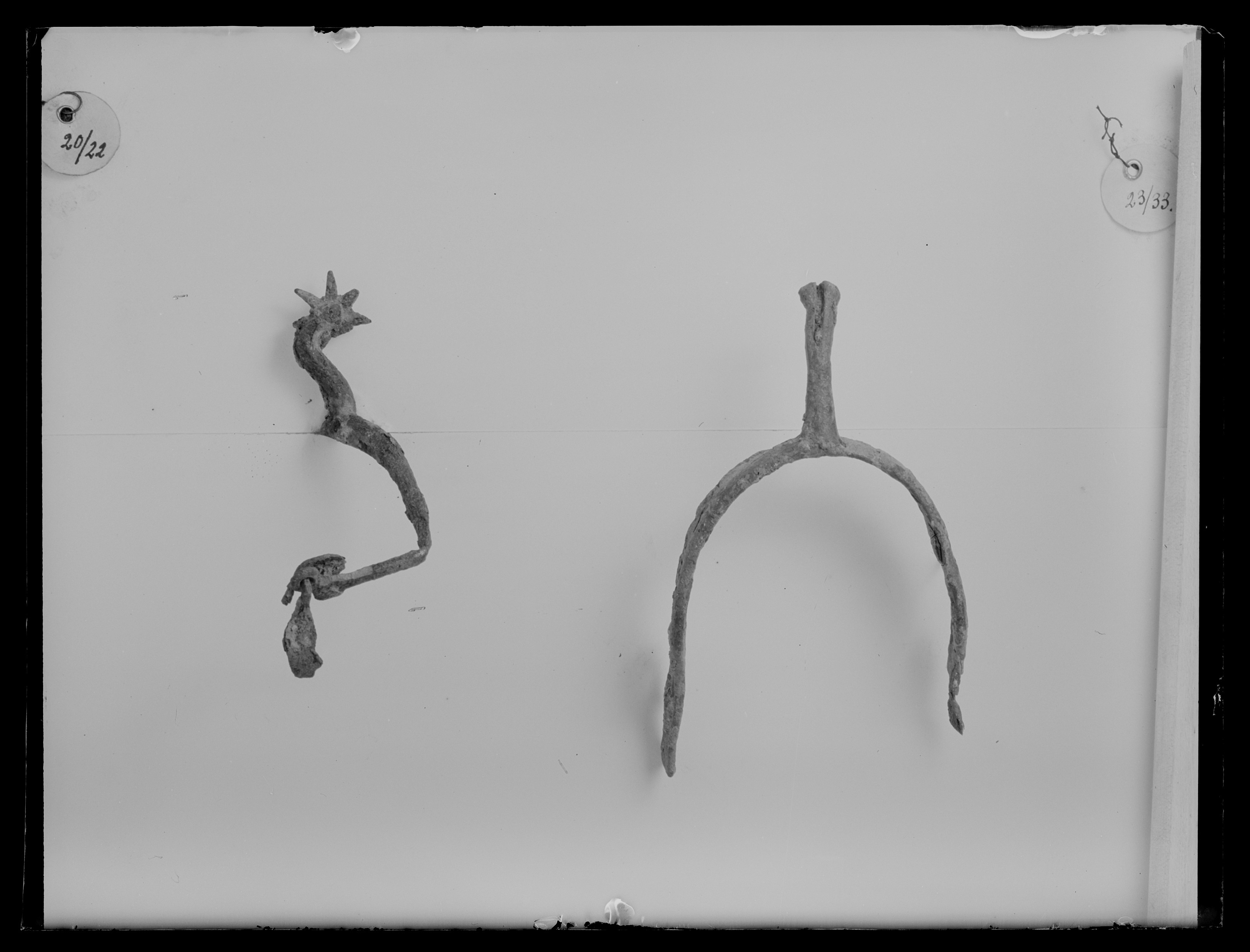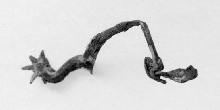 Sporre av stål. Skänklarna troligen u-formade något böjda, nu förvridna med konvex utsida, böjda i ändarna med i ena änden ett hål med en hake samt en rund knapp på hals, i andra änden ett hål borta, i det andra en hake. Hals, s-formigt böjd, rundstavig. Klinga med sex kvarvarande uddar.