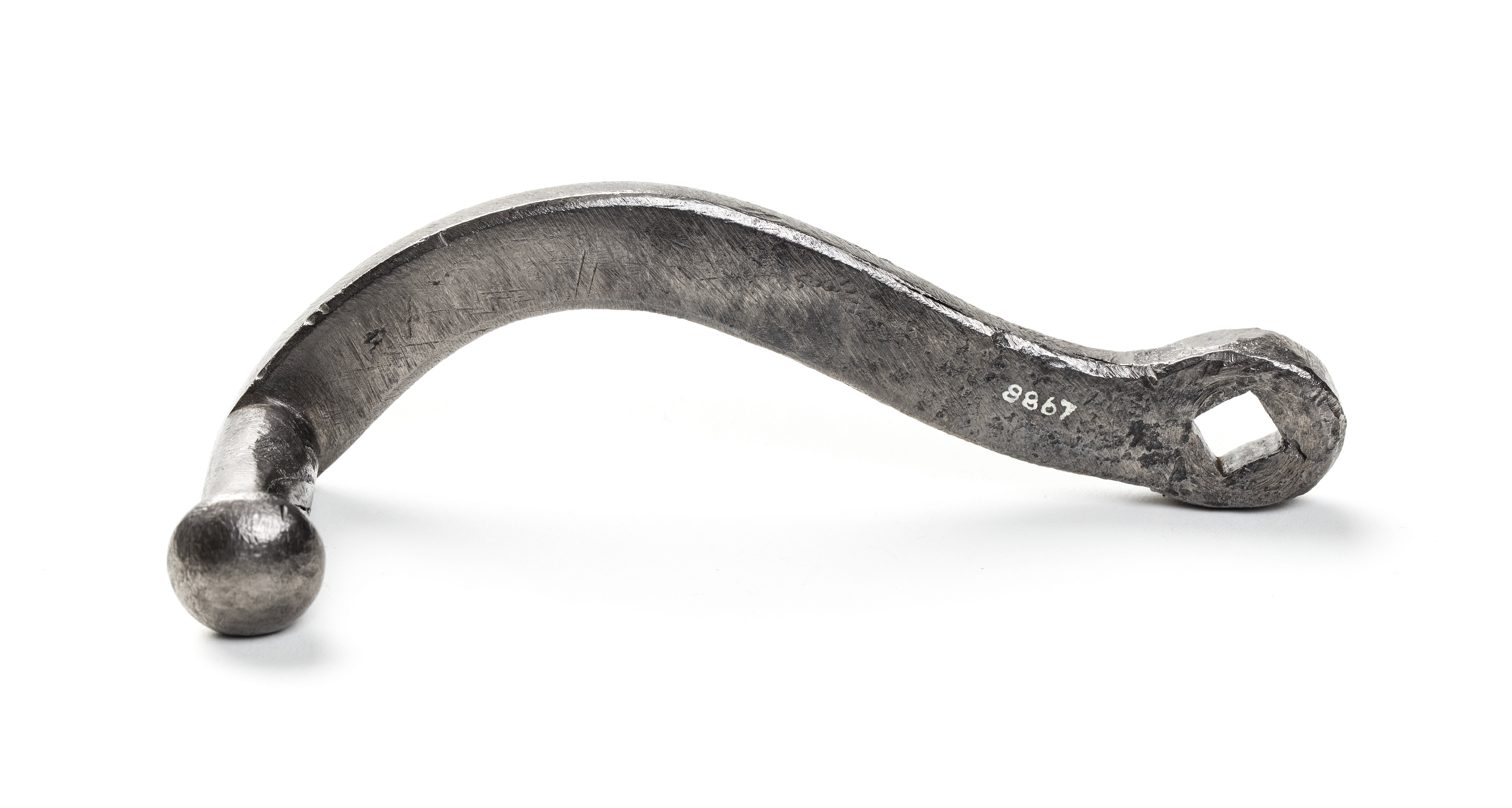 S-böjd vev, i ena änden försedd med ett fyrsidigt hål axel, i den andra med en i rät vinkel placerad rund ten för drivrem eller dylikt, avslutas med en liten knopp.