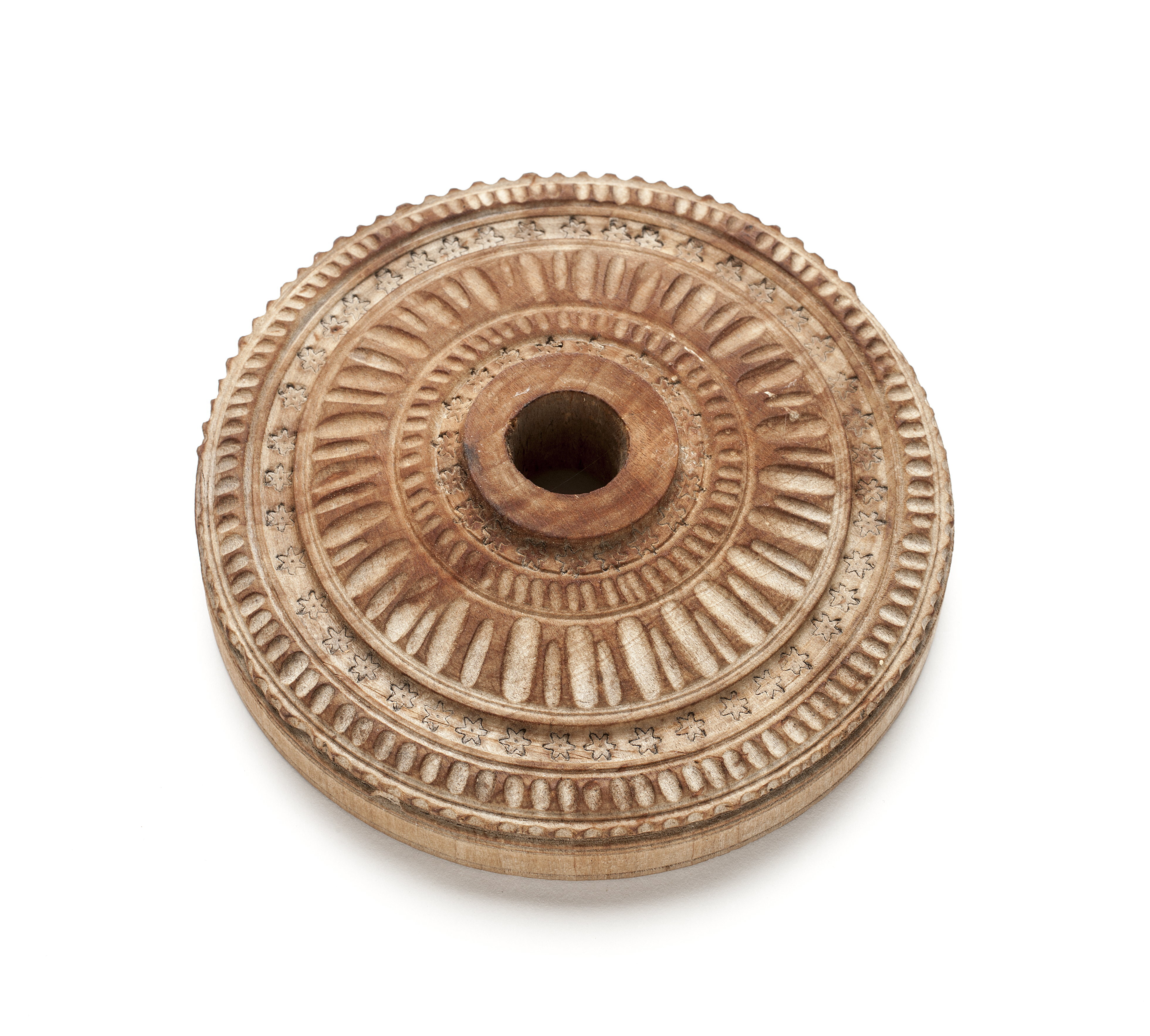 Svarvad profilering med skurna urtag och stämplade stjärnor. Runt hål.