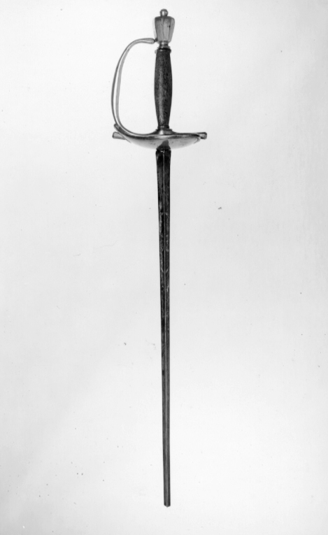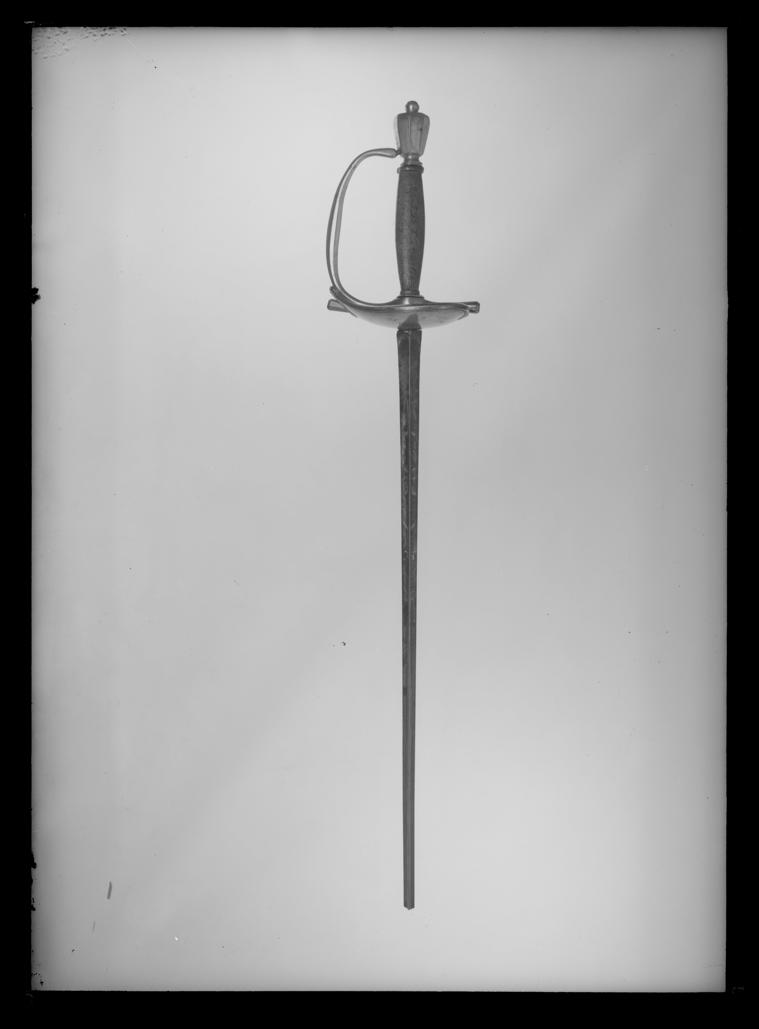 Fäste av förgylld mässing. Knapp hög, omvänt konisk och med åttsidigt tvärsnitt. Parerstänger korta, raka med åttsidigt tvärsnitt, något vidgade i ändarna. Parerplåt hjärtformig av s. k. boat-shell-typ. Kavel av trä med fyrsidigt tväsnitt, på ena sidan påskrift med bläck: "RiksRådet Frih. Olof Cederströms värja från Beatelund". Klinga rak,, treeggad, s. k. stukatklinga med etsad damaskering och förgyllda ornament, på ena sidan i form av ett manshuvud.