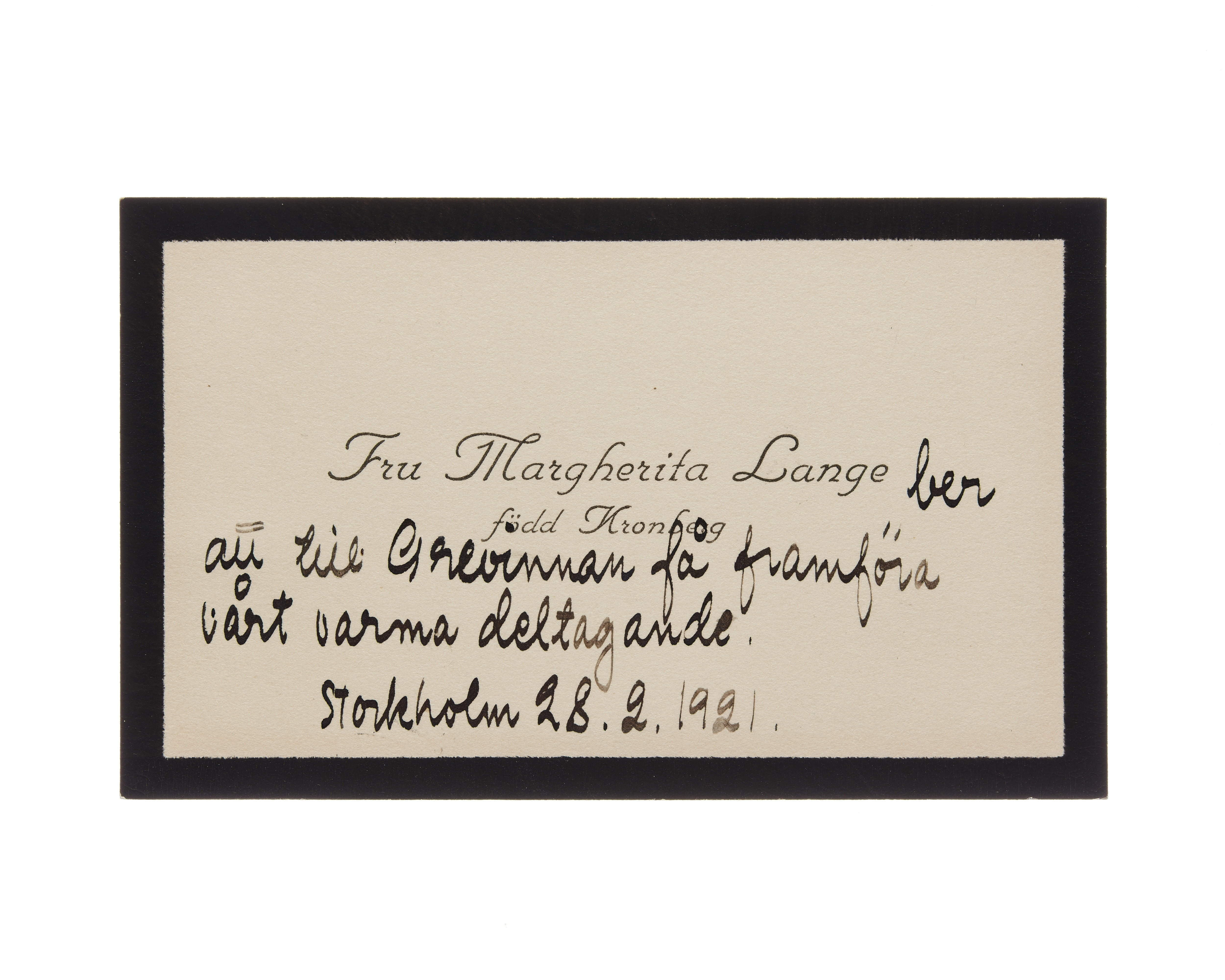 Två visitkort från Fru Margherita Lange, f. Kronberg. Första kortet daterat 1921 samt sorgkant. Andra kortet daterat 1921 samt sorgkant. Handskrift "...".