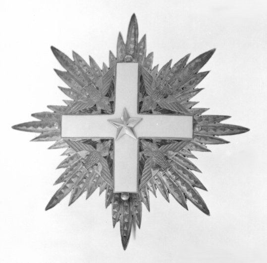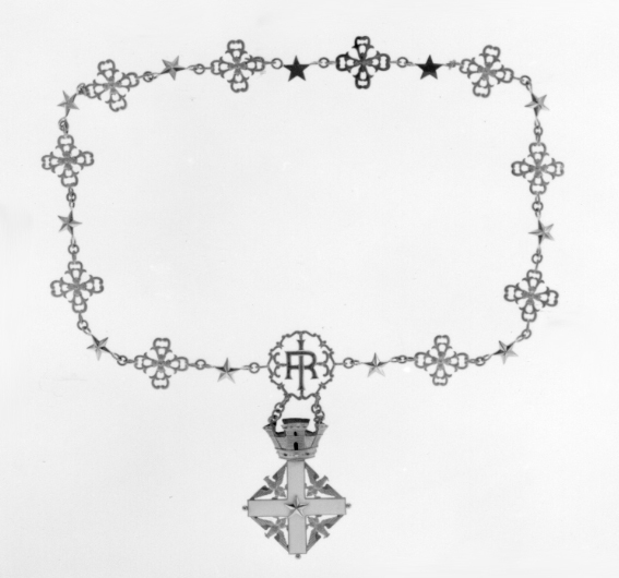 Kedja sammansatt av 22 länkar av förgyllt silver. Tio stora, korsformiga, länkar sammansatta av bladrankor, i mitten en fyrbladig blomma, allt av matt guld. Elva små länkar i form av femuddiga, fasetterade stjärnor av blankt guld. Mitt på kedjan en större länk i form av namnchiffer i blankt guld: R I, omgivet av en tunn, delvis genombruten krans av bladrankor. På varje länk två räfflade ringar, mellan länkarna en räfflad ring. Ringen på en större länk utbytt mot en hake i samma utförande. Nertill på mittlänken två ringar för fästning av klenoden. Länkarnas frånsidor släta och blanka, på mittlänken tre små rombiska stämplar: 750.