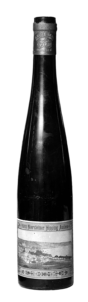 NIERSTEINER HIPPING, Auslese 1911, trettioen helbuteljer Av mörkbrunt glas. Kägelformiga, med stärkring kring mynningen; bottnen insänkt. Etikett ljusröd, på denna text i svart mot guldstreckad botten, i mitten en landskapsbild i svart. Kapsylfragment av förtent bly, brunrödfärgat, på detsamma exportfirmans namn (A. Koch Söhne, Kgl. Hoflieferanten, Mainz) och två svenska riksvapen, det ena under kunglig, det andra under kronprinslig krona (firman leverantör åt dåvarande konungen och kronprinsen av Sverige), allt i förgylld relief. Höjd: 35,6 cm.; diameter: 7,7 cm.