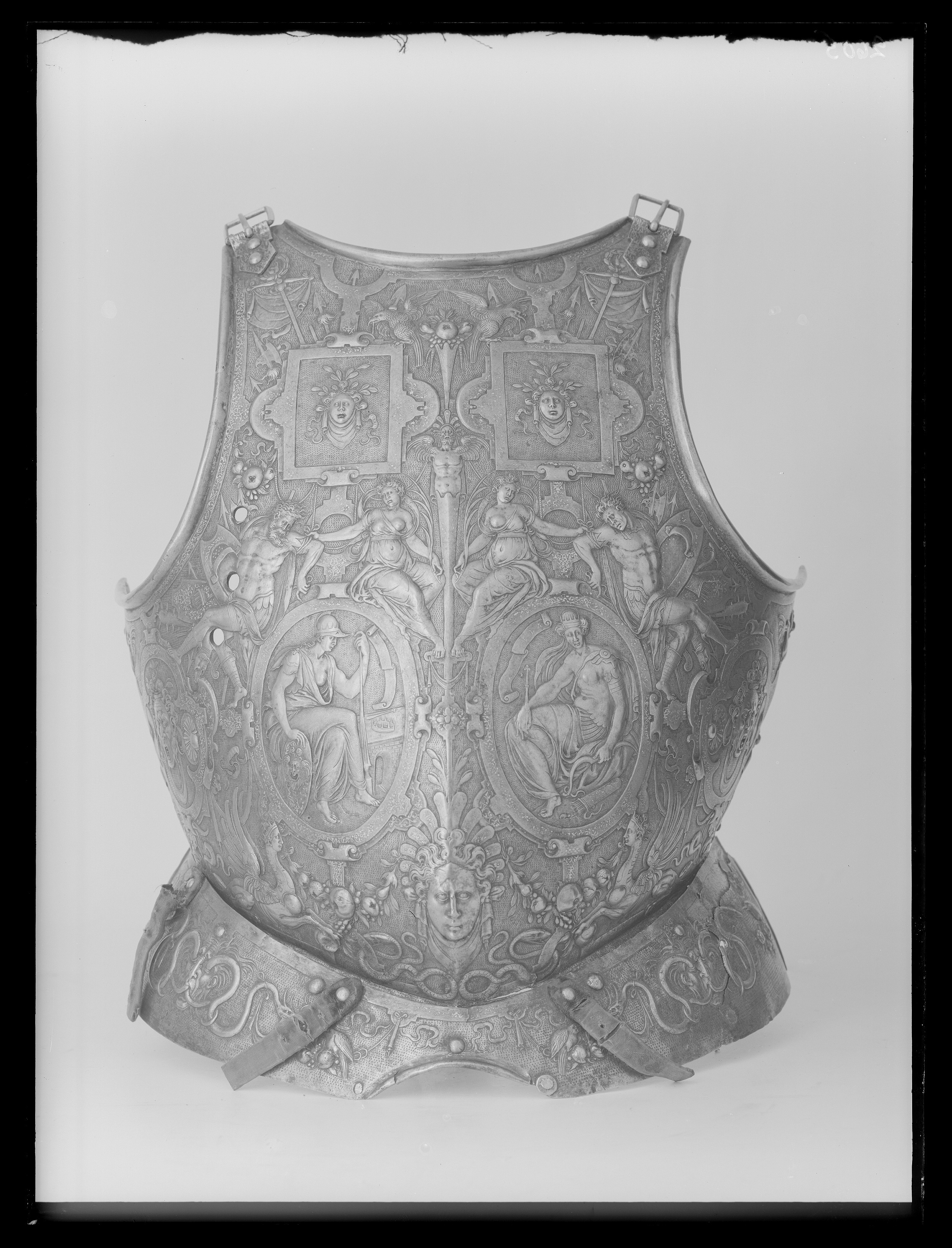 Bröstharnesk i stål med med svagt spetsig buk, etsad och driven dekor samt guld. Tre hål för lanshake(?) på höger bröst. Bukpansar fastsatt nedtill, med nya nitar. Dekoren symmetriskt uppbyggd. Kvinnogestalterna i bröstharneskets kartuscher är sannolikt de båda götiska amasondrottningarna Lampeda och Marpesia.