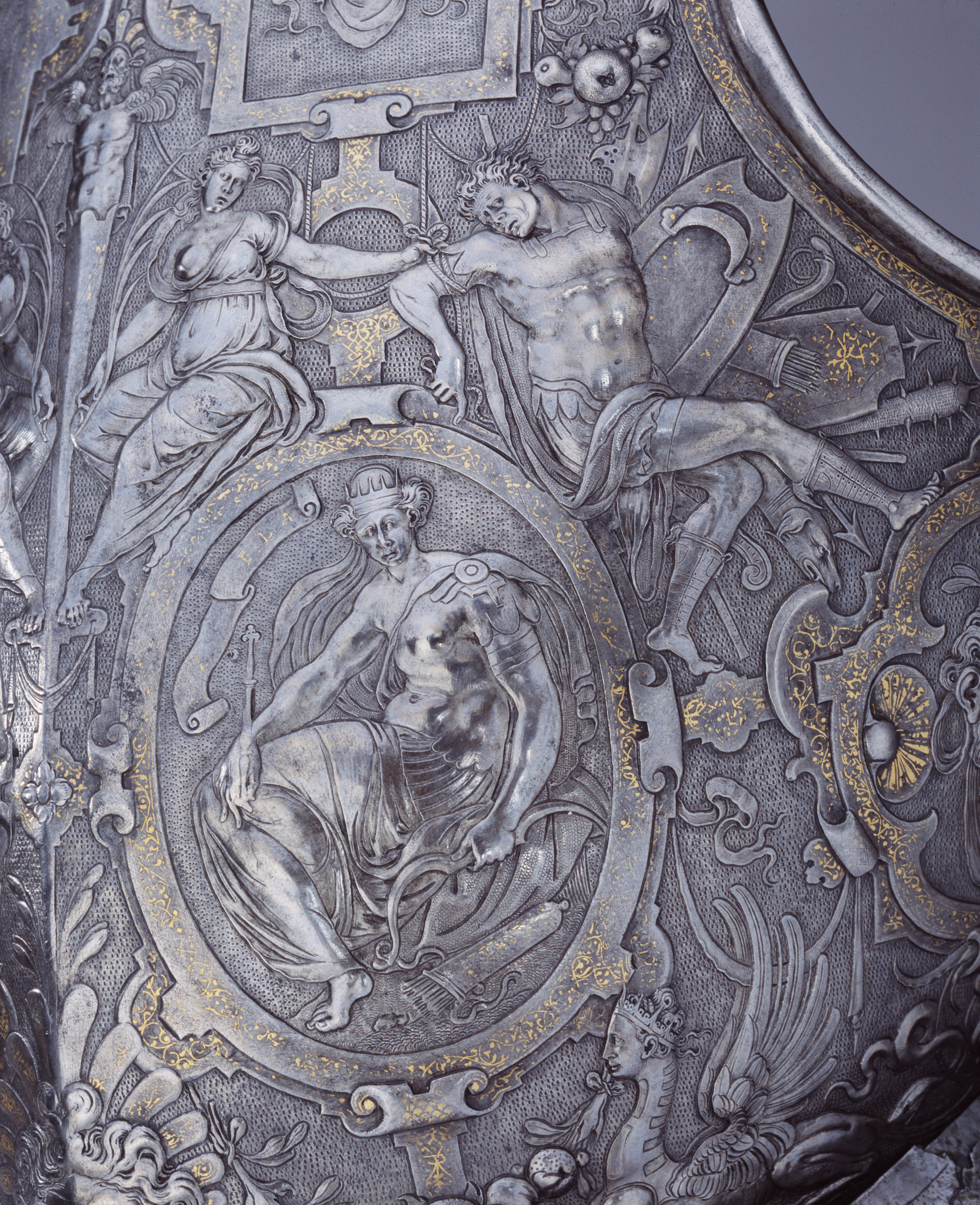 Bröstharnesk av driven och punsad stålplåt tillhörande Erik XIV:s paradrustning
