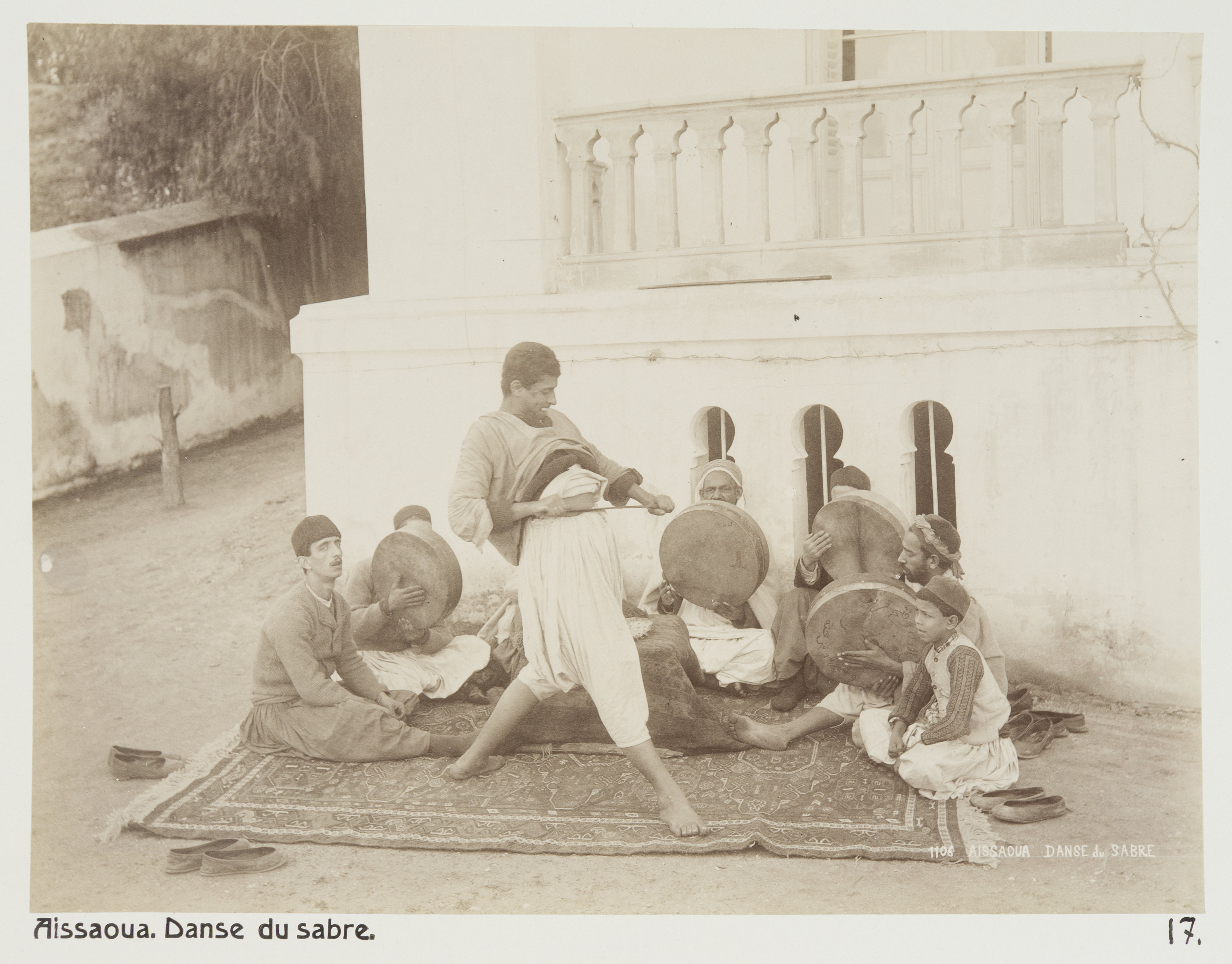 Aissawa (el. Aissaoua - religiös-mystisk sammanslutning grundad i Marocko). Sabeldans. Bilden är en dubblett till LXVI:F.20. Bilderna med inventarienummer LXVI:K.H.01.-137. är inköpta av Johanna Kempe, f. Wallis, i Alger, Biskra, Tunis, Constantine, Oran och Blidah vid hennes vistelse i nämnda städer tillsammans med sin dotter och svärson, Wilhelmina och Walther von Hallwyl, dotterdottern Irma samt fröknarna Caroline Pflaum och Ida Uhse under deras resa genom Algeriet och Tunisien samt åter över Schweiz 11 februari - 19 maj 1889. Förestående uppgifter lämnade med ledning av fröken Ida Uhses Reseanteckningar. Vissa av bilderna är dubbletter till bilder i inventarienummerserien LXVI:F.01.-138. som köptes in av Wilhelmina von Hallwyl under samma resa.