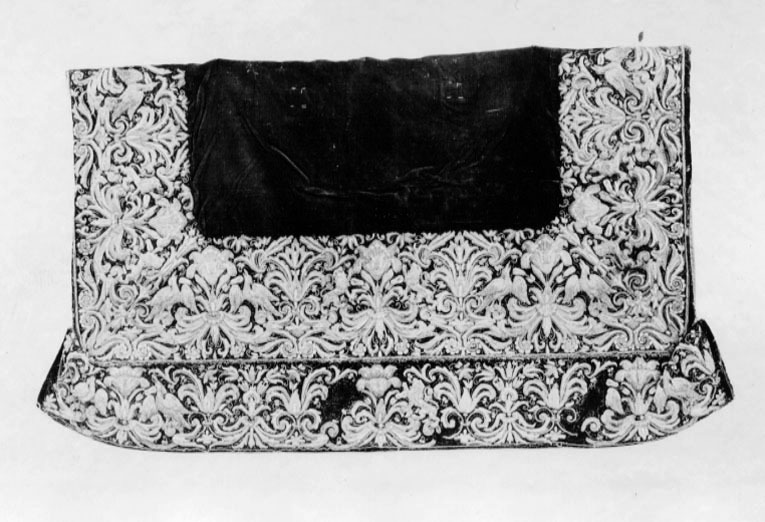 Bottentyg av röd sammet. Bård 200 mm bred längs sidorna och nederkanten. Vid nederkanten har en 150 mm bred bård sytts fast. Längs det större styckets sidor och nederkant en 3 mm bred snodd omgiven av två en mm breda snoddar. Bårdernas broderier är yttäckande i läggsöm och applikation i relief av guld, silver och silke i gult och beige. Mönster av två omväxlande akantusmotiv med på det största styckets bård varannan akantus varannan gång symmetriskt omgivet av två örnar och varannan gång av två lejon. På den nedre bården är den icke djuromgivna akantusen symmetriskt omgiven av två mindre akantusmotiv. En 10 mm bred kavelfrans av guld och silver i sömmen mellan nederkantens bårder. Stadkant längs överkanten och nedre bårdens underkant, 10 mm gulbrunrandig och en 5 mm grön rand. Foder av röd yllekypert, endast 50 mm cirka under nedre bården. Fyra lädertampar med mässingsringar längs överkanten.