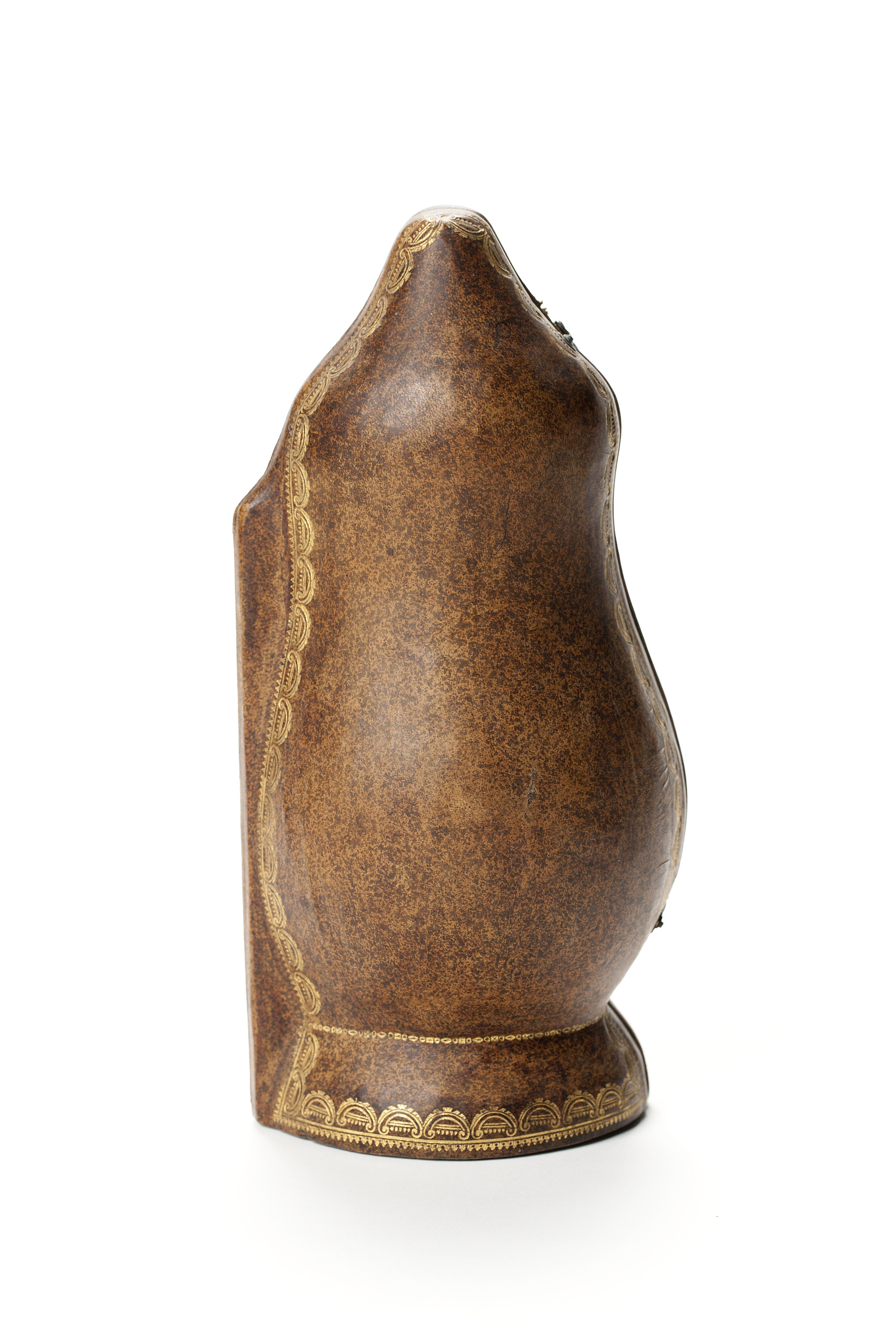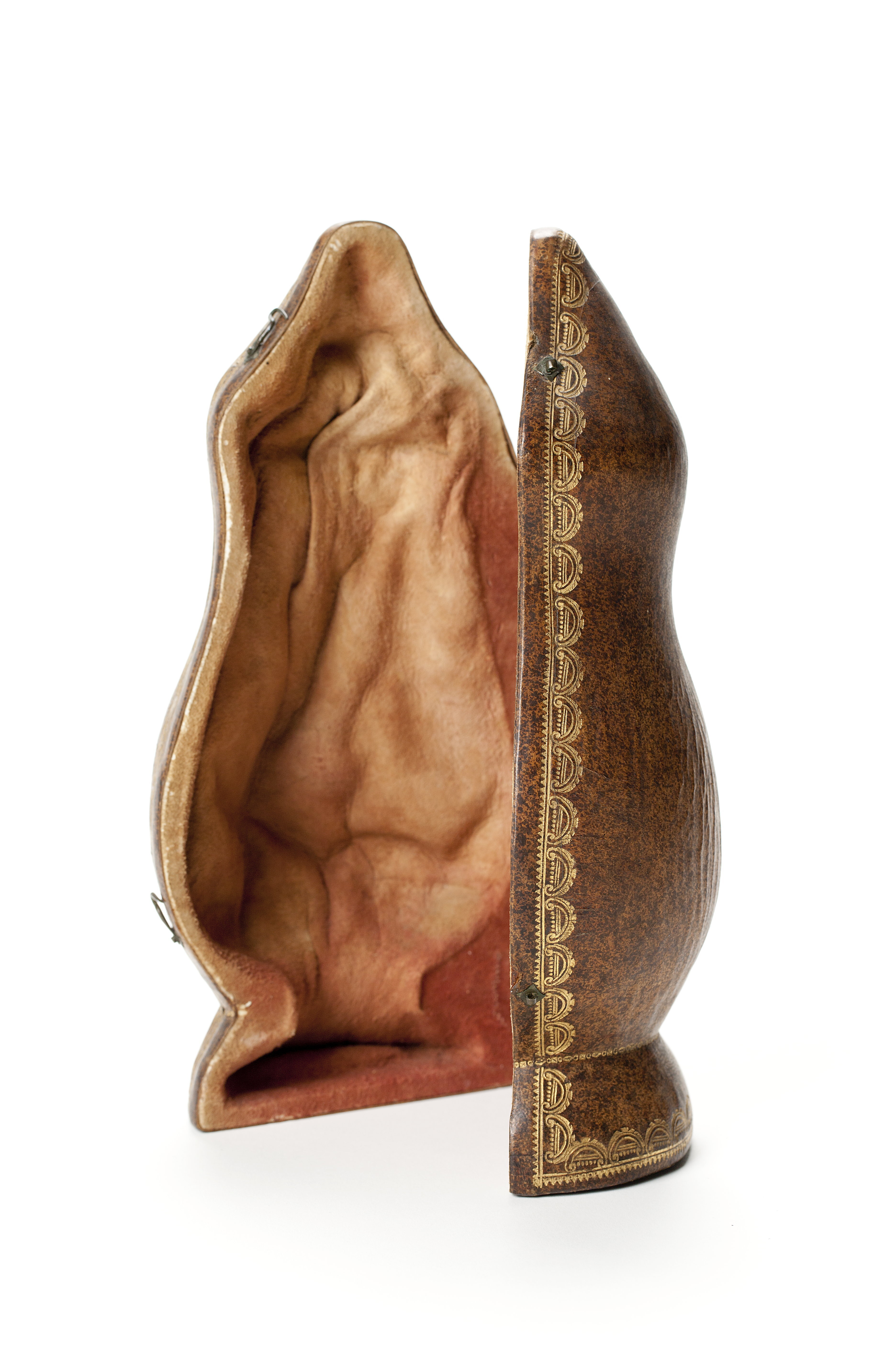 Fodral av trä klätt med brunt, sprängmarmorerat kalvskinn med guldtryck. Format efter flaskan och med två hakar av mässing, ledar på skinnet. Inuti klätt med rött sämskskinn. Sett ovanifrån är fodralet ovalt till formen. Ostämplad.