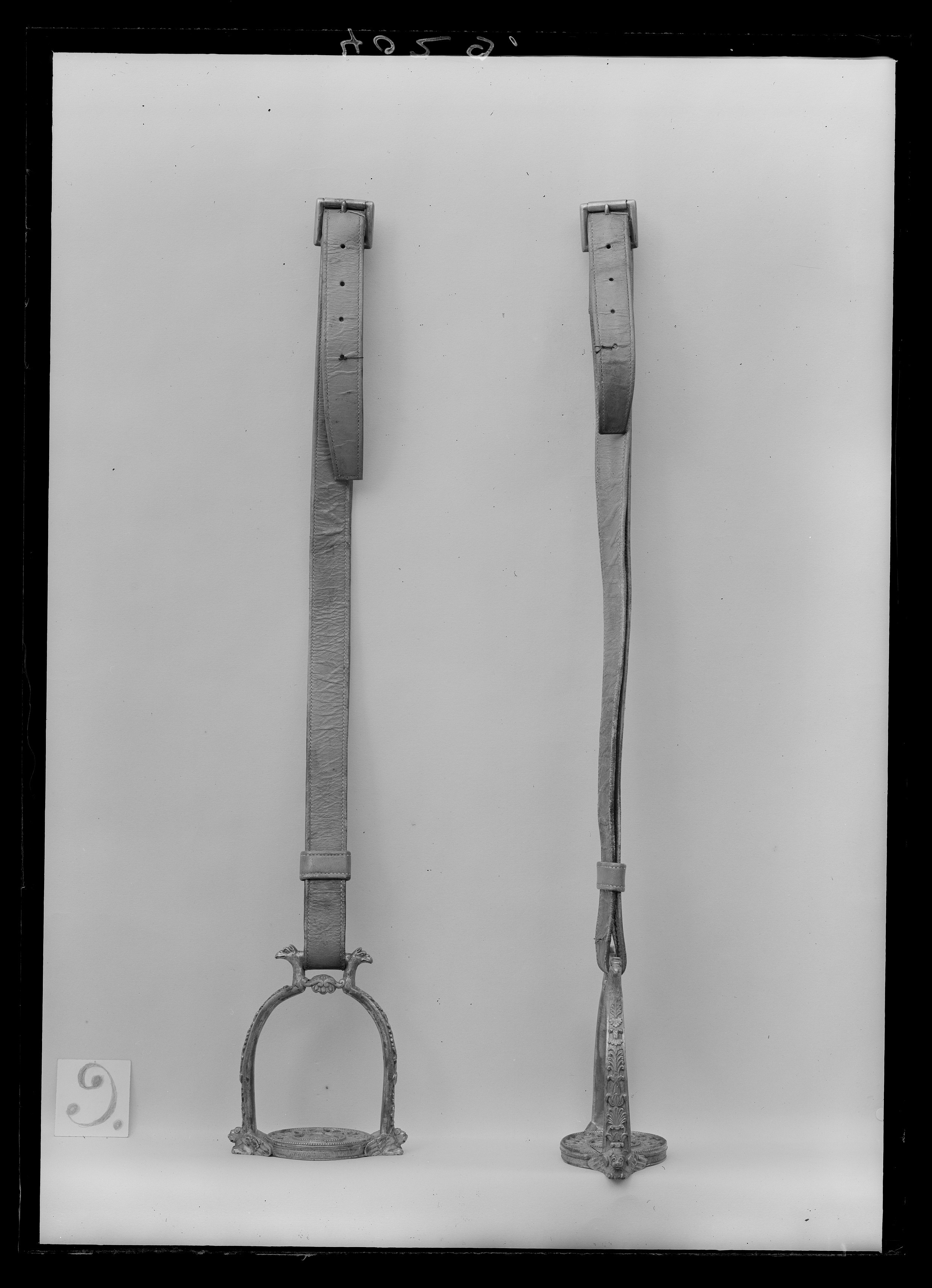Stigbygel av förgylld mässing med u-formad bygel. Skänklarna vidgas nedtill, på utsidan ciselerad dekor i form av palmetter och blad mot punsad botten. Nedtill avslutade med griphuvuden. Remläge i form av fast rektangulär ögla vars sidor består av två örnhuvuden vända utåt, nederkanten med ett palmettliknande ornament. Runt genombrutet trampstöd med en 12-uddig stjärna i mitten omgiven av en flikig bård. Trampstödets ytterkant räfflad.