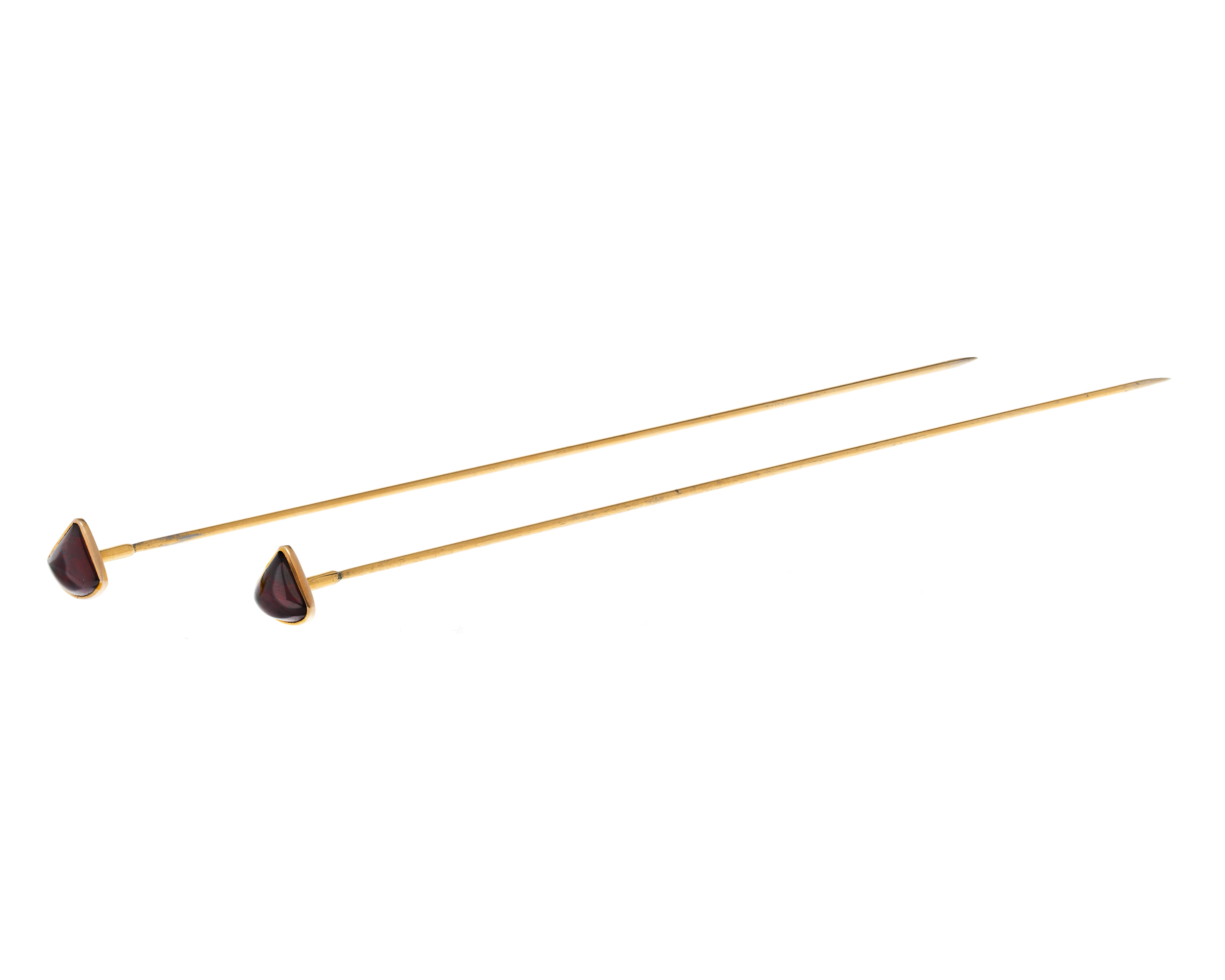 Hattnålar av förgyllt stål med guld och orientalska granater. Svenskt arbete, Stockholm, från 1904: juvelerarfirman J.E. Torsk. Utan stämplar. Mått: L 16,7; knopp sidlängd: 1 och 1,1