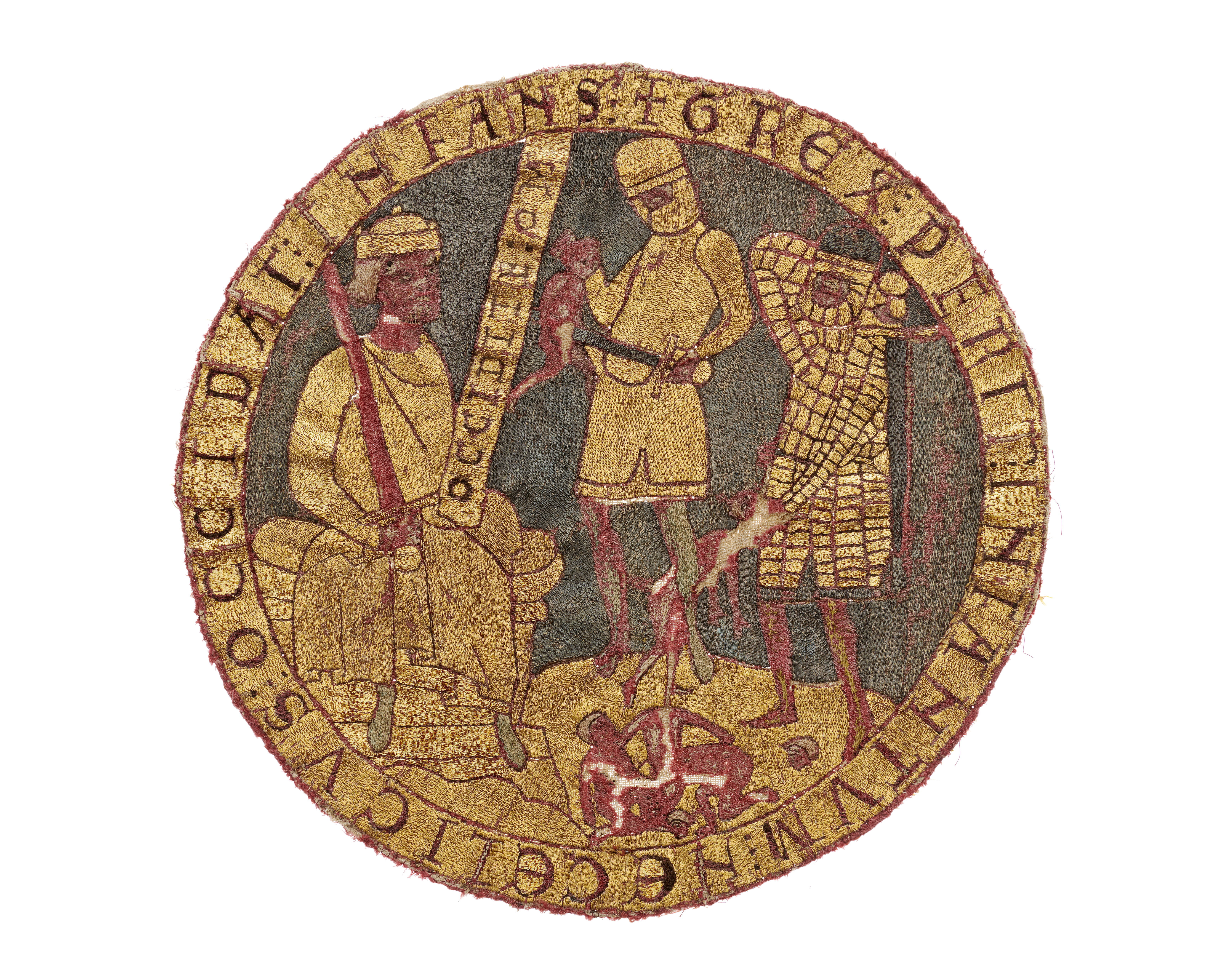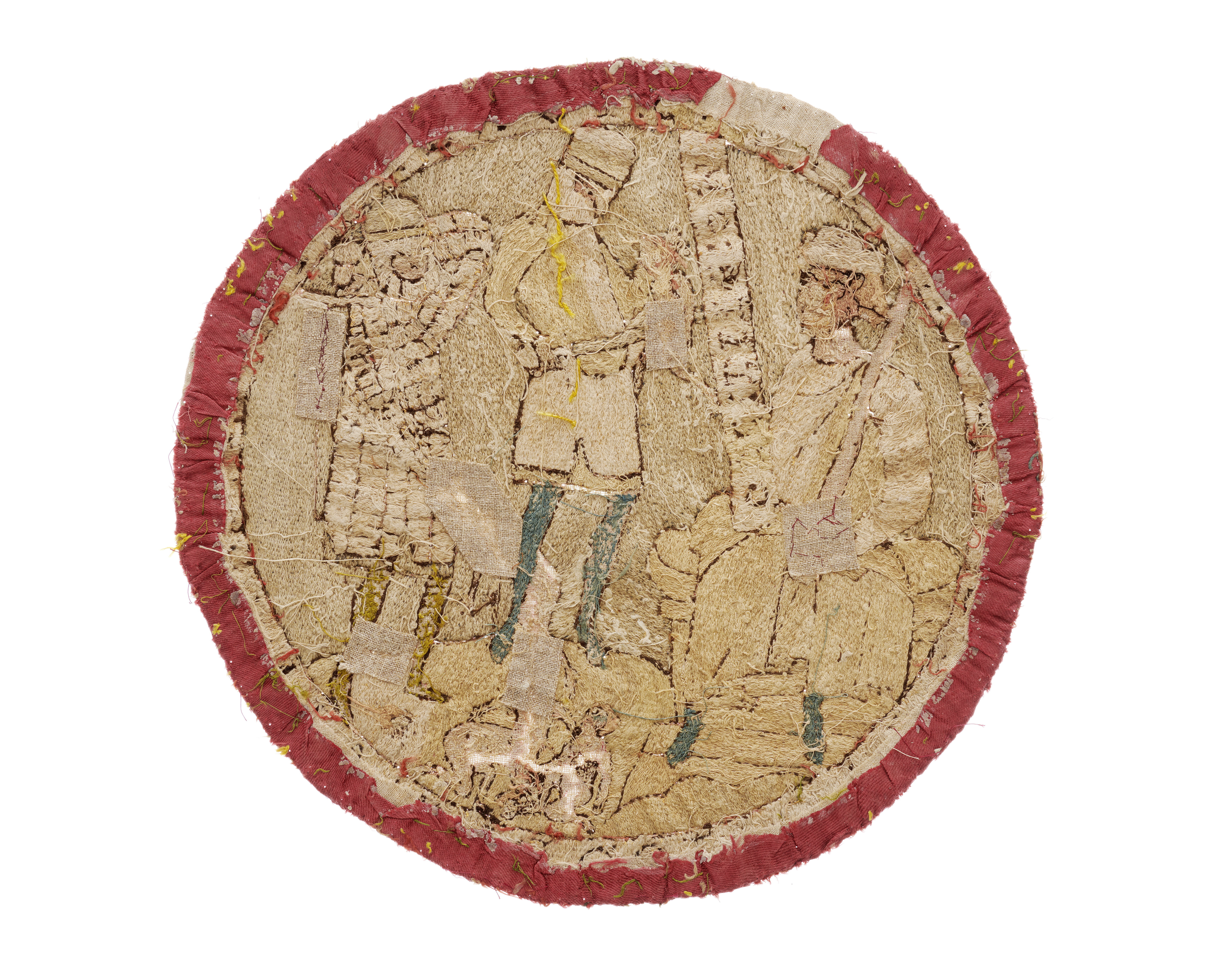 Guld-, silver- och silkebroderad rundel på röd samitum med framställning av Kristi liv. Broderiet utfört i neddragen läggsöm och klyvsöm. Troligen franskt arbete, sent 1100-tal. Scen Barnamorden i Betlehem