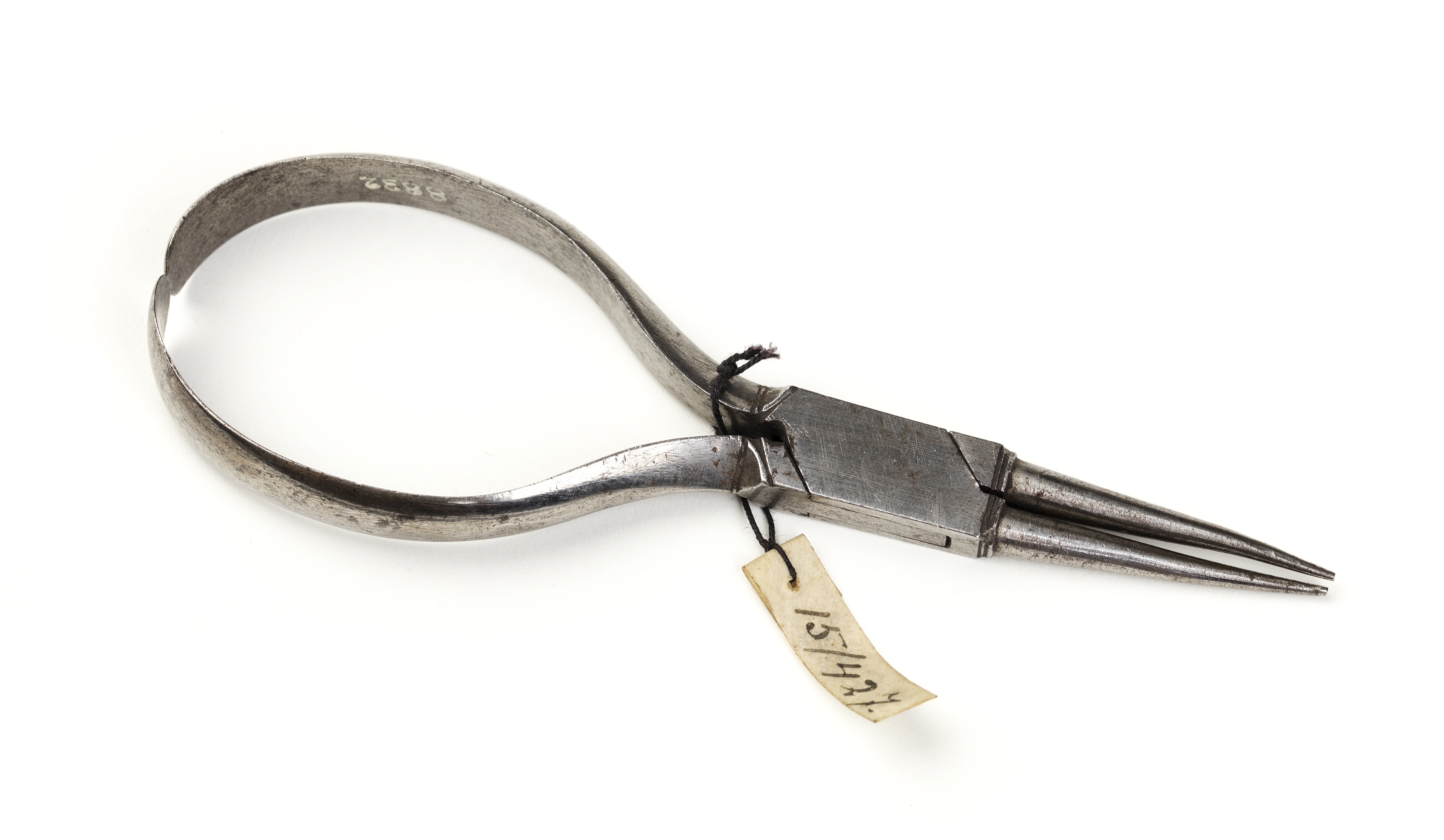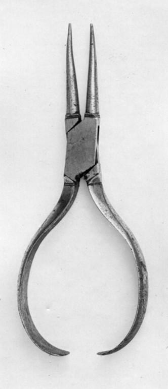 Stämpel: IRS N 3. Böjtång med långa, koniska käftar och dubbel, nitad led och böjda skänklar.