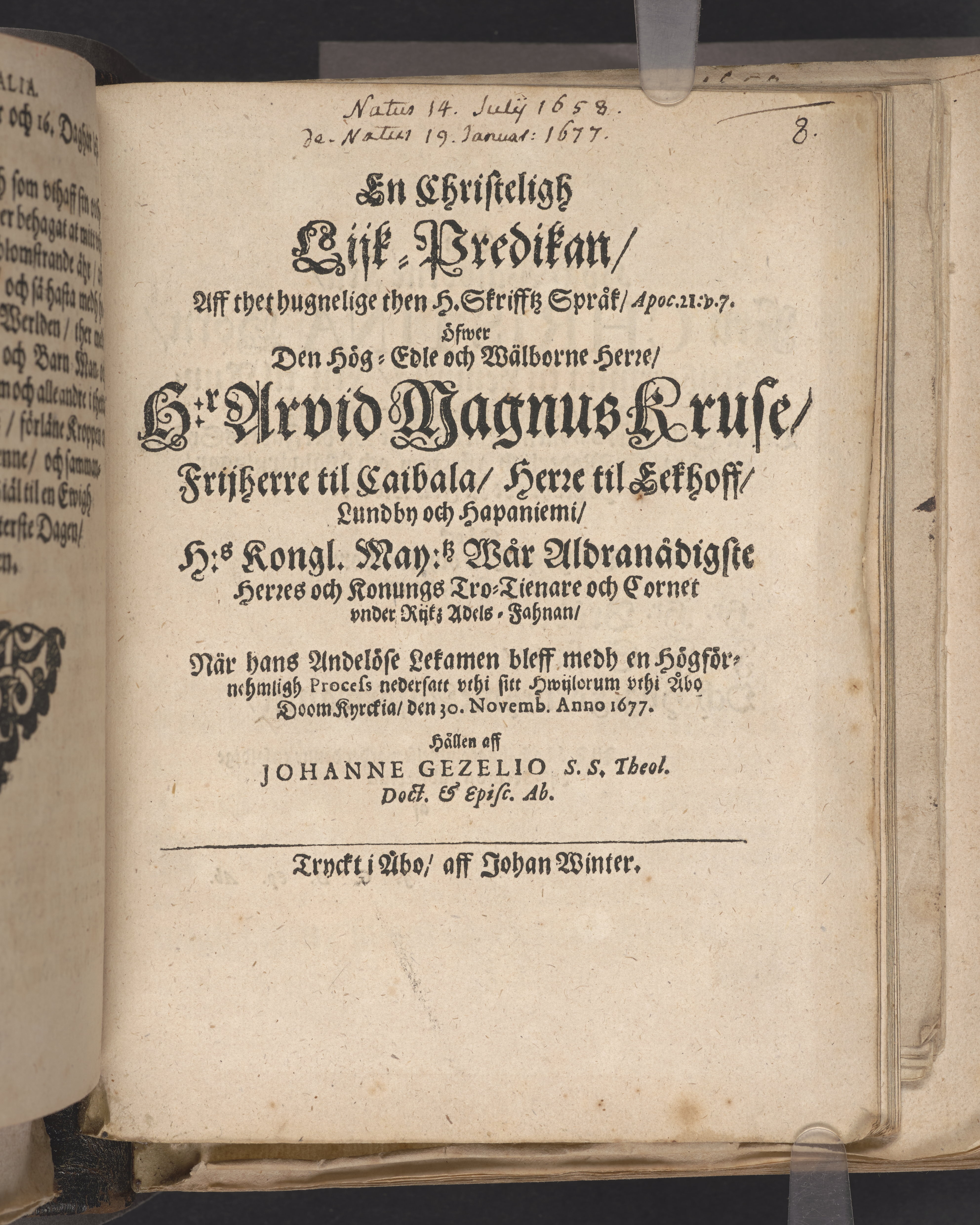 En christeligh lijk-predikan ... öfwer den hög-edle och wälborne herre, H:r Arvid Magnus Kruse, frijherre til Caibala ... vthi Åbo doomkyrckia, den 30. novemb. anno 1677. Hållen aff Johanne Gezelio ... Tryckt i Åbo, aff Johan Winter.