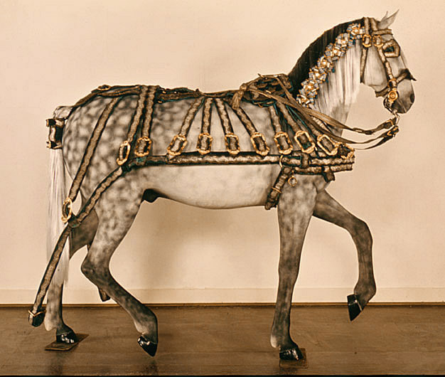 Seldon, bröstsele, på vänster mellanhäst, bestående av brösta, rektangulär däckel med tre tömlöpare (ringar), runt ryggstycke (s.k. rosen), linlyftare, åtta bärremmar och en stödrem på vardera sidan samt svansrem och svanskappa. Stomme av läder, överklätt med blå sammet i kypert och på översidan silvergalon med guldfrans längs kanterna. Bröstan på insidan blått linne i tuskaft. En främre rektangulär däckel, ca 500 x 250 mm, tre tömlöpare och applicerade kronor, motställda, med på var halva en kungakrona och tre adelskronor, två och en, i läggsöm och plattsöm av guld och silver. Med fyra remmar från var kortsida fäst på bröstan, ca 1150 x 150 mm, och med fyra remmar från bakre långsidanfäst vid en rund däckel , ca 210 x 240 mm, med tre applicerade adelskronor, två och en, i läggsöm och plattsöm av guld och silver. Denna är fäst vid vardera draglädret, ca 320 x 70 mm, på en skjutbar rem, ca 580 x 80 mm, runt själva draglädret med fyra remmar och vid linlyftaren, ca 1400 x 100 mm, med fyra remmar. Linlyftaren är tudelad mot draglädren och fäst i dessa. På linlyftarens bakre sida är på mitten fäst en tamp, ca 70 x 50 mm, på var sida om denna en rem ca 35 x 300 mm, med en "vinge" på höger sida, ca 160 x 80 mm, hopsatt med den runda svansremmen, ca 300 mm lång, som har en med en läderrem fäst svanskappa, ca 200 x 180 mm, med 160 mm långa tampar i ena kortsidan att fästas i spännen på andra kortsidan. På var sida om detta en rem, ca 70 x 250 mm, hopsydd av två 35 mm breda remmar, delad på mitten, och en lång rem ca 1000 x 50 mm fäst vid draglädret. En ögla ca 100 mm lång på bröstans vänstra sida. Draglädret som även fungerar som graglina fäst vid ringen på bröstans kortsidor, avslutas med en löpkrok. En bukgjord sammanlagt ca 1000 mm lång fäst vid bröstans ringar, i ena änden förgyld stålsölja med löphylsa. Alla remmar fästa med mässingspännen vid draglädret, bröstan och rektangulära däckeln. Fastsydda runt däckeln och linlyftarens bakre kant. Fästade med ringar vid linlyftarens främre kant. Söljorna är rektangulära, av förgylld mässing med rokokoornament, tillverkade av Ludolph Weser. Konserverad 1971. (Beskrivning avser föremålet före konservering.)