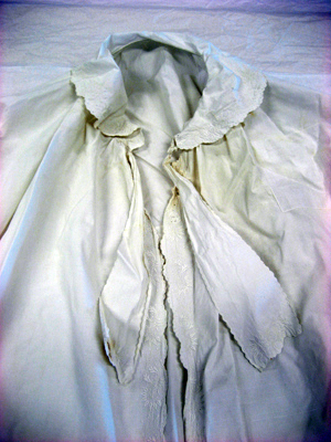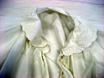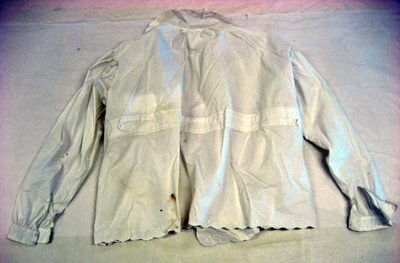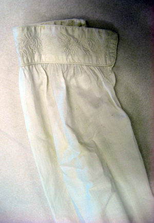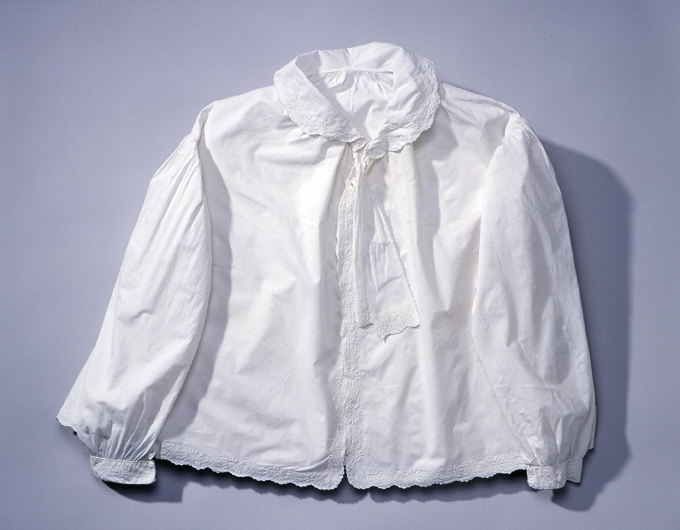 Kamkofta av vitt linne sydd med två fram- och ett bakstycke samt med två kilar i sidorna. Koftan kantas nedtill av en broderad bård med ett blommönster av ett vitt plattsömsbroderi. Kamkoftan knyts upptill med två breda, broderade band. Kragen är rund med samma slags broderi som på band och i kantningen. Ärmarna är långa, sydda ur ett stycke med 40 mm breda, broderade slag. Vid ärmslutet förekommer ett sprund, l. 150 mm, vilket knäpps med en liten vitklädd knapp. Kamkoftan är rynkad i axelsömmarna. På insidan sitter påsytt två breda, vita linneband runtom midjan och på utsidan av bakstycket sitter ett brett linneband med en dragsko.