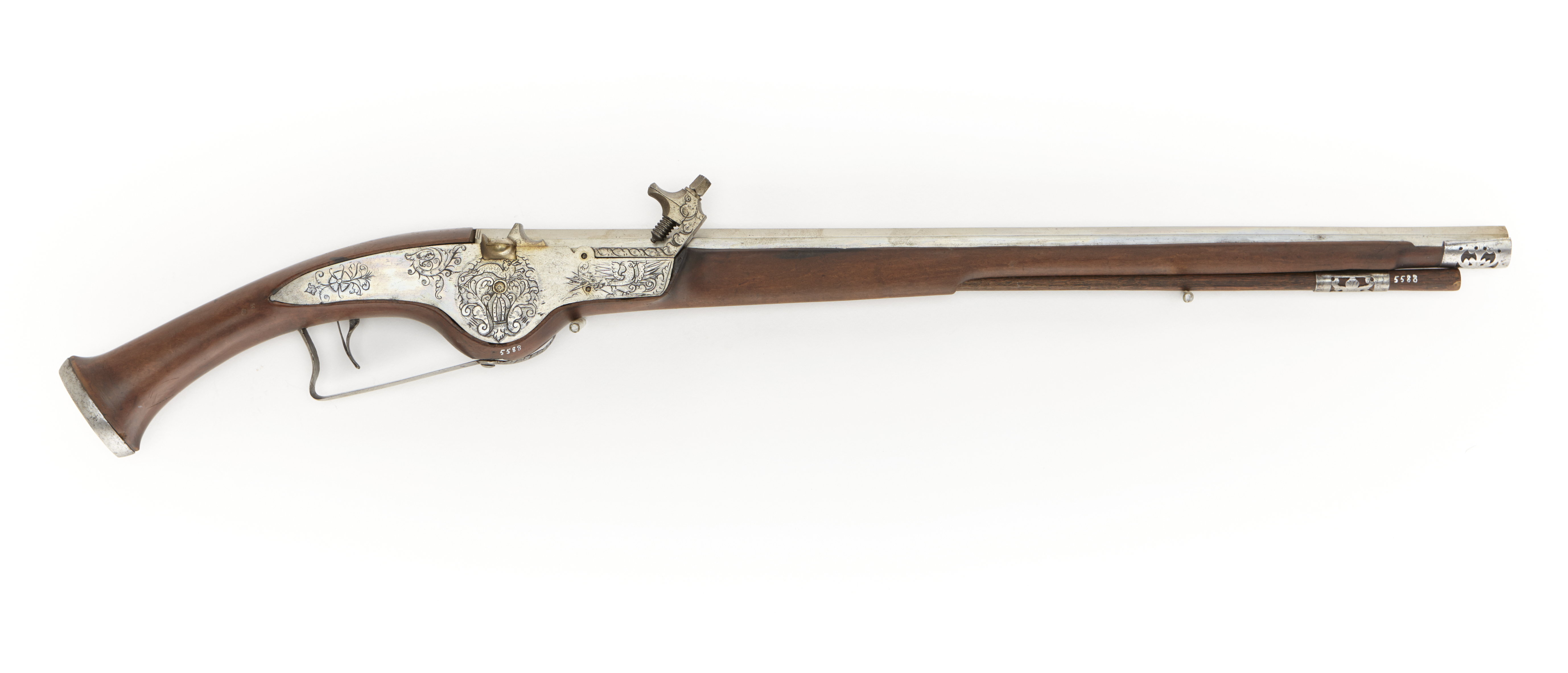 Åttkantig, slätborrad pipa av stål med ett häfte och en hake på pipans undersida. På kammarens sida en stämpel med en hammare. Hjullås med plant låsbleck av fransk typ. Graverad dekor på låsblecket i form av slingor och djur. Invändigt hjul. Hane i flykt med låsblecket. Låsblecket utsvängt för hjulet. Hane med lös underkäke, rakgraverad hanhals och hankropp. Hjulaxeln utdragen åt anslagssidan. Brun helstock av trä med spetsoval kolvkappa av stål med fasade kanter. Kolven utsvängd för hjulet. Sidbleck av stål med graverad dekor, består av två runda plattor med ett runt hål. Överrörka av stål, genombruten med blomma. Näsband av genombrutet stål i form av blomma. Varbygel av stål med fasade kanter. Tillbehör: Laddstock. Märkt: 85 bakom låsblecket, stanstyp 5376.