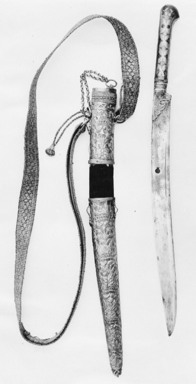 Balja av cicelerat silver med ett yttäckande mönster av c-formiga bågar och rankbårder. Mitt på baljan ett 38 mm högt fält klätt med röd sammet, på utsidan ett lodrätt applicerat band av svarta trådar och guldtrådar. Upptill på fram- och bakkanten runda koppelringar. Nedanför det röda sammetsfältet två byglar på vardera sidan. Liten, genombruten doppsko. I koppelringarna fäst bäranordning av ett rött, 22 mm brett band med invävda stickningar av guldtråd, vilket bildar ett rutmönster. I den ena koppelringen dessutom fäst en dubbel kedja av små, runda länkar. Kedjan avslutas med en stor ring i vilken hänger rester av ett beslag med svagt synlig tughra-stämpel. Denna stämpel är även synlig på baljan på bakkanten ovanför sammeten.