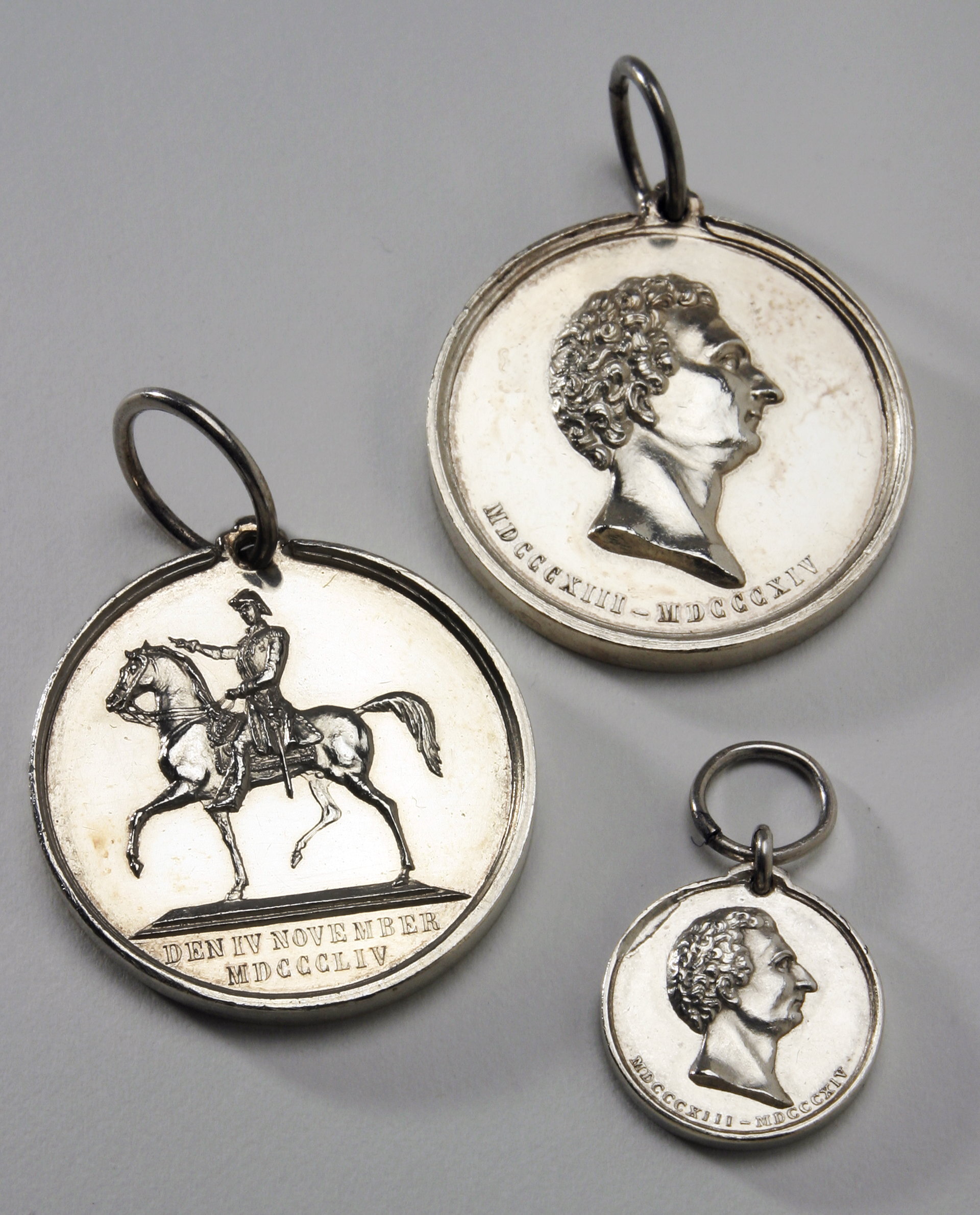 Åtsida: Karl XIV Johan, halsbild, profil h, omskrift nertill: "MDCCCXIII MDCCCXIV" Frånsida: Karl XIV Johan ryttarstaty vid Slussen, Stockholm i avskärning nertill text: "DEN IV NOVEMBER // MDCCCLIV". I kanten upptill trepassformig bygel, däri fäst öppen ring. Utdelad till de norska och svenska armeernas deputerande, som var närvarande vid avtäckningen av Karl XIV Johans staty den 4 nov. 1854, 40-årsdagen av Sveriges och Norges förening. Att begagnas till civil dräkt.