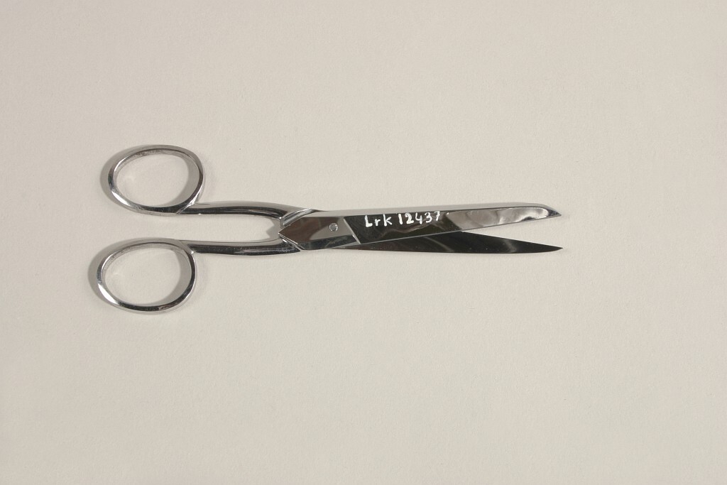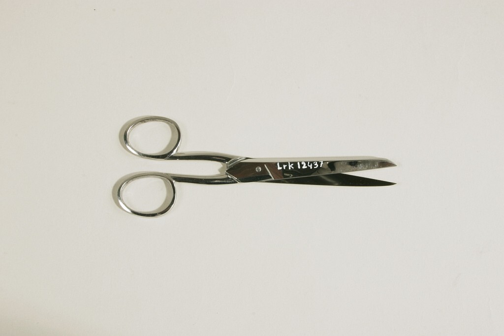 Sax av polerat stål. På ena skänkeln stämplat "BROOKES // et GROOKES" och en klocka. Räfflat skruvhuvud.