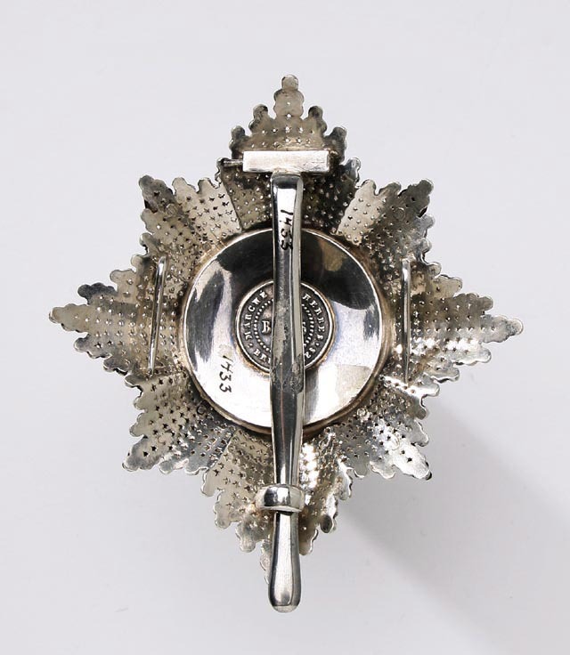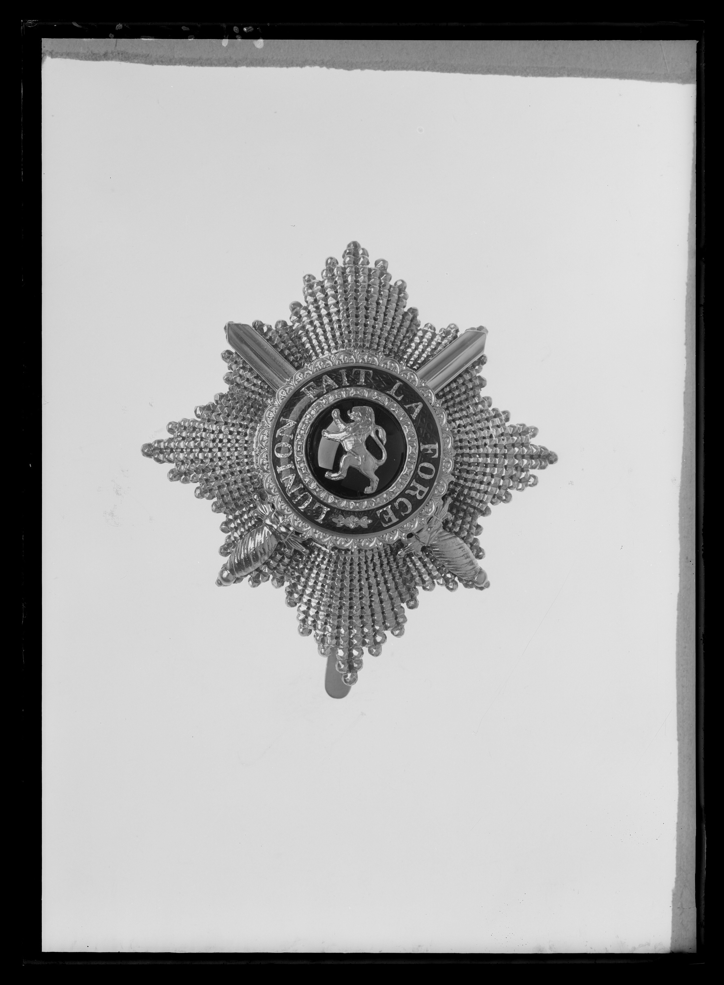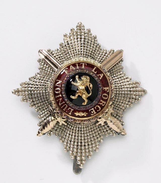Åttauddig, välvd, flinkerad strålstjärna av silver, därpå fäst två korslagda svärd av guld. Däröver fäst en välvd medaljong, täckt med svart emalj, därpå fäst ett krönt lejon av guld. Guldkantad ring täckt med röd, genomsynlig emalj, däri guldtext: "L'UNION FAIT LA FORCE". På medaljongens baksida en rund, skålad platta, därpå ett runt firmamärke av silver, relieftext mot punsad bakgrund: "C.J. // BULS // 103" samt omskrift: "MARCHÉ AUX HERBES BRUXELLES". Vertikalt placerad säkerhetsnål samt två hakar.