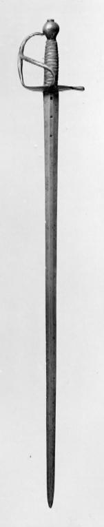 Modellenlig. Ytans svärtning avlägsnad. Kavellindningen ej ursprunglig. På basen av klingans insida är inslagen proberstämpeln P (bokstavens ögla ej synlig, bortslipad?).