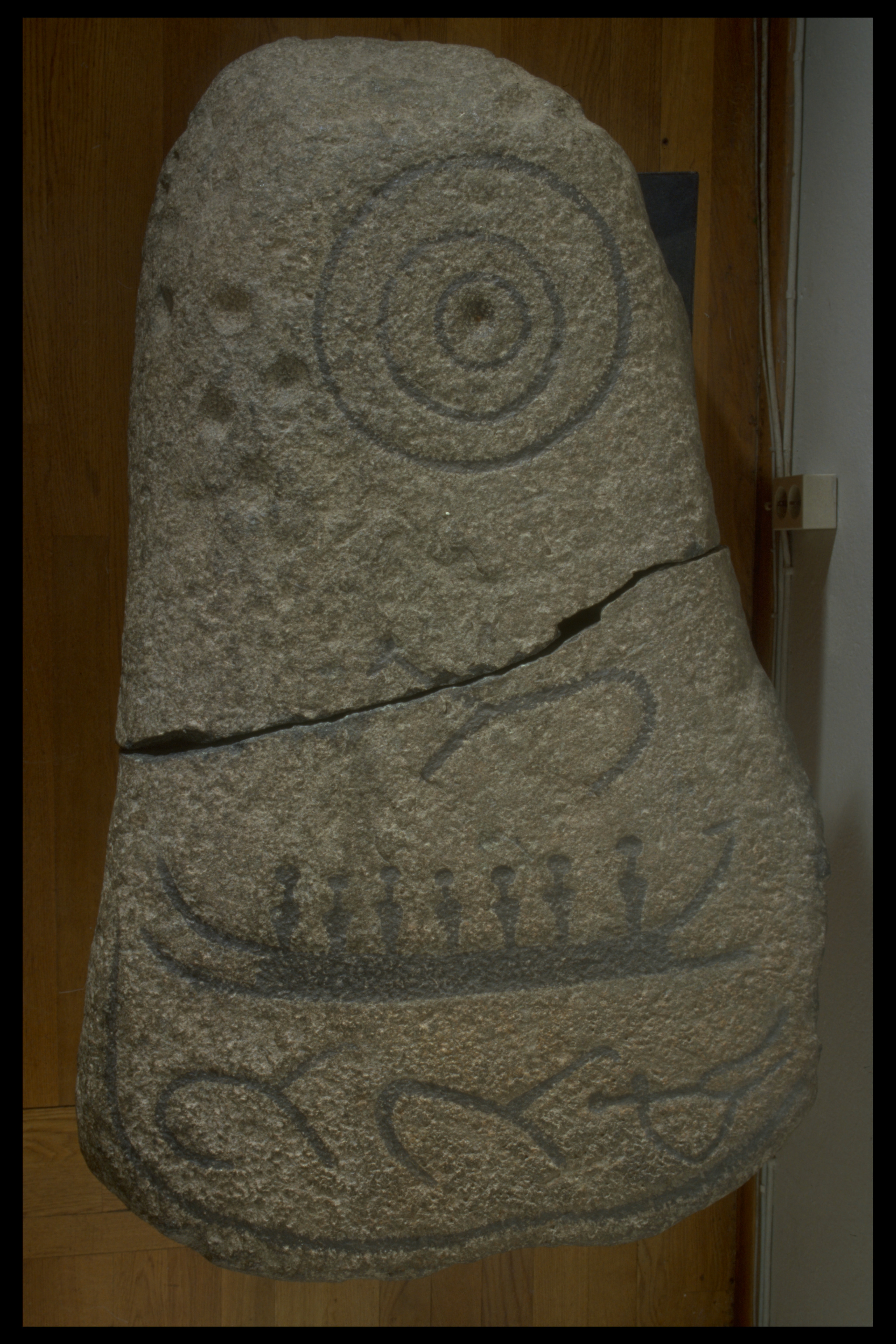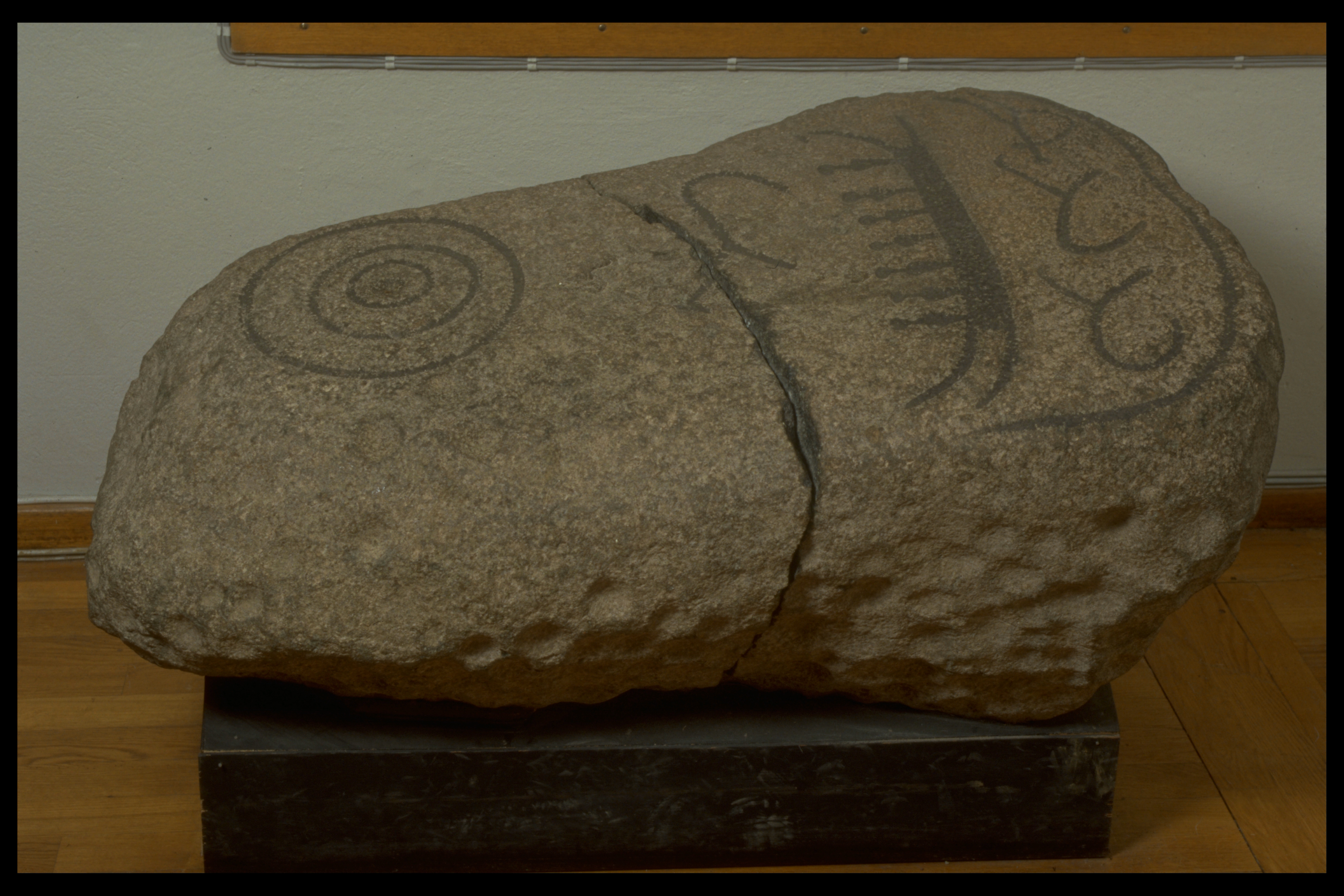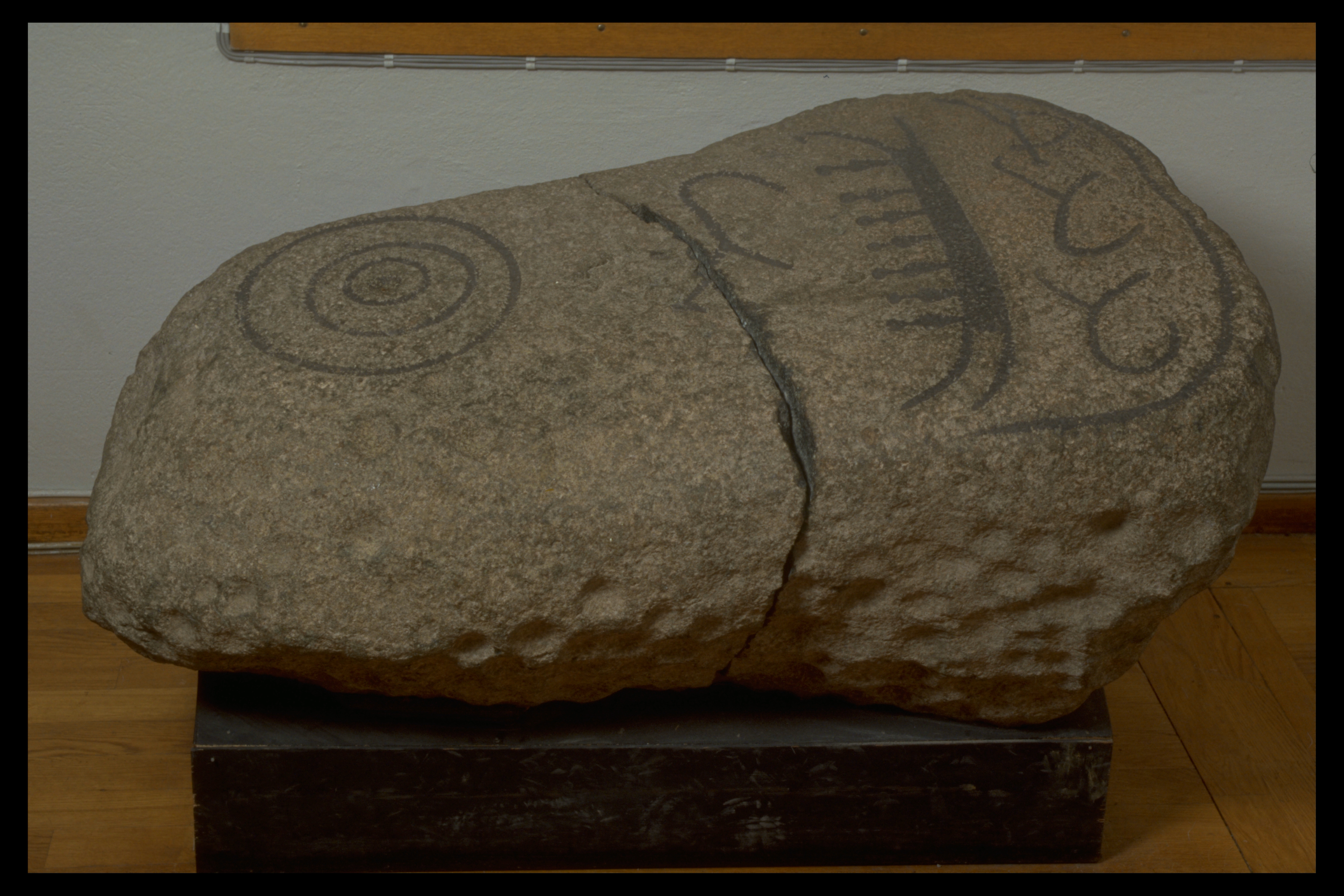 naturligt format stenblock med hällristningar av ett skepp med 7 besättningsmän, en koncentrisk cirkel, ett fyrfota djur ovan skeppet och två fyrfotadjur och en människa? under skeppet. Avslutas nedtill med en ram. Runt hela blocket finns dessutom minst 150 skålgropar. Funnen på tomten till en fastighet norr om ett gravfält. Efter fyndet gjordes en efterundersökning då det påträffades en grav från äldre järnålder?. Osäker koppling mellan hällristningsblocket och eventuell kontext.