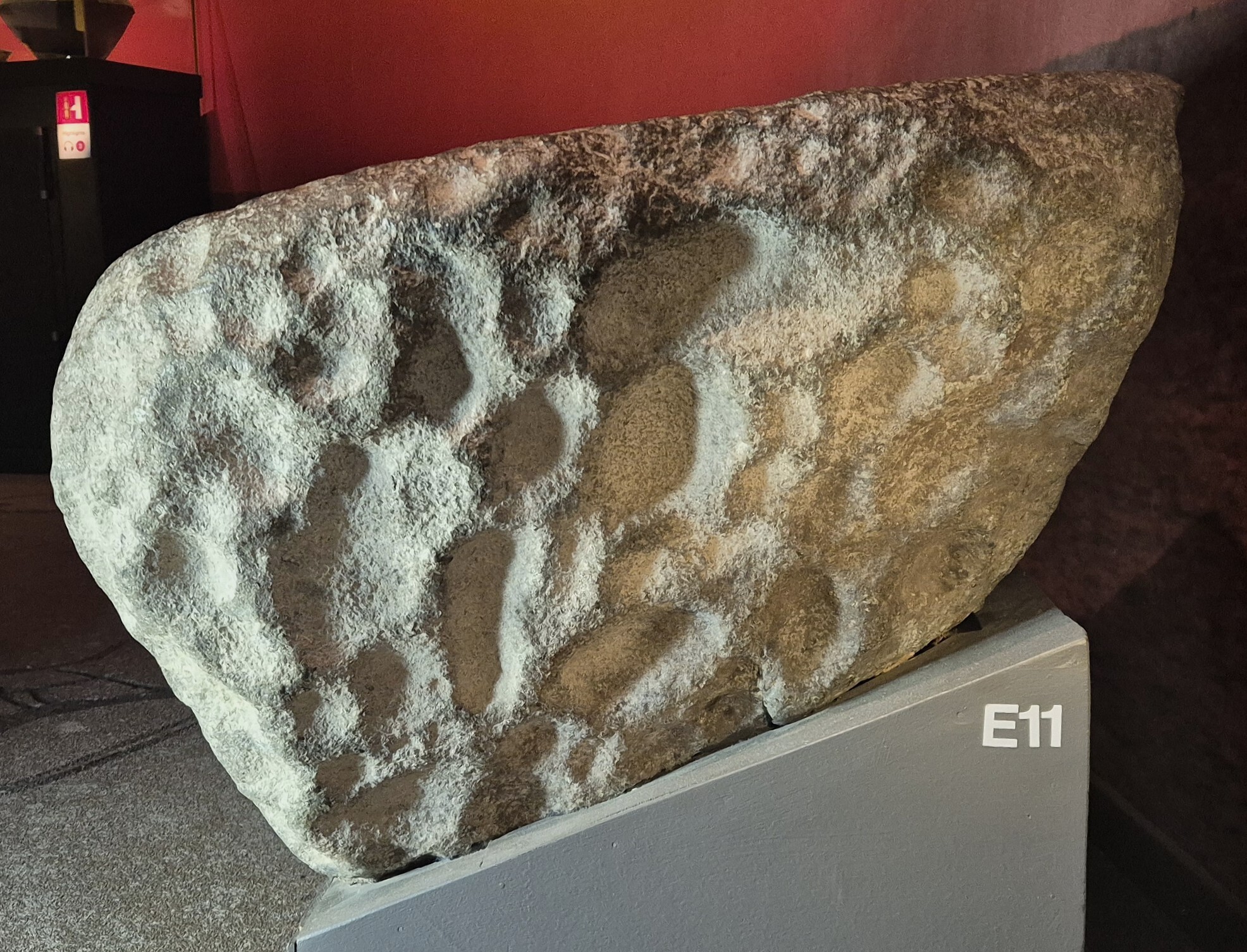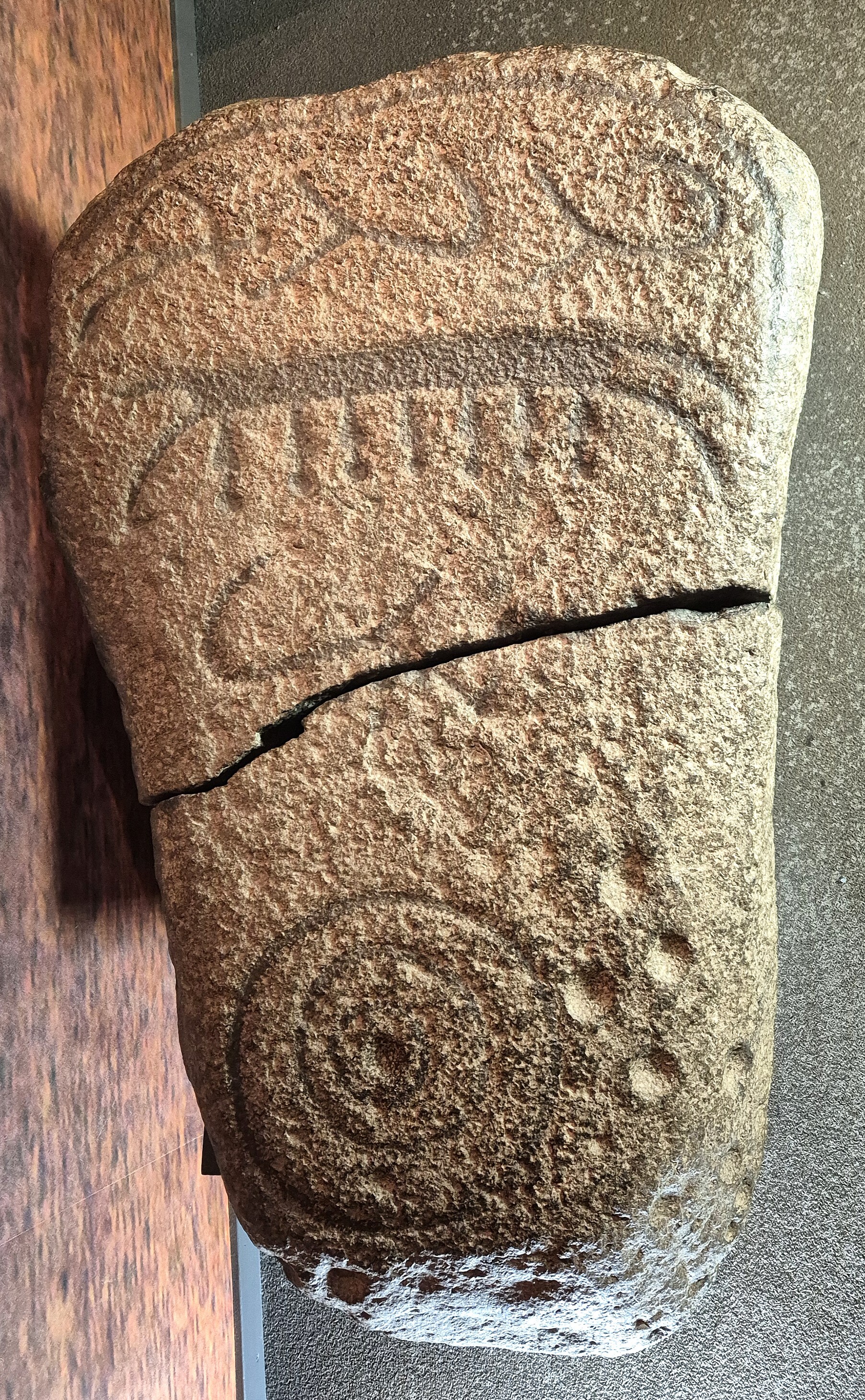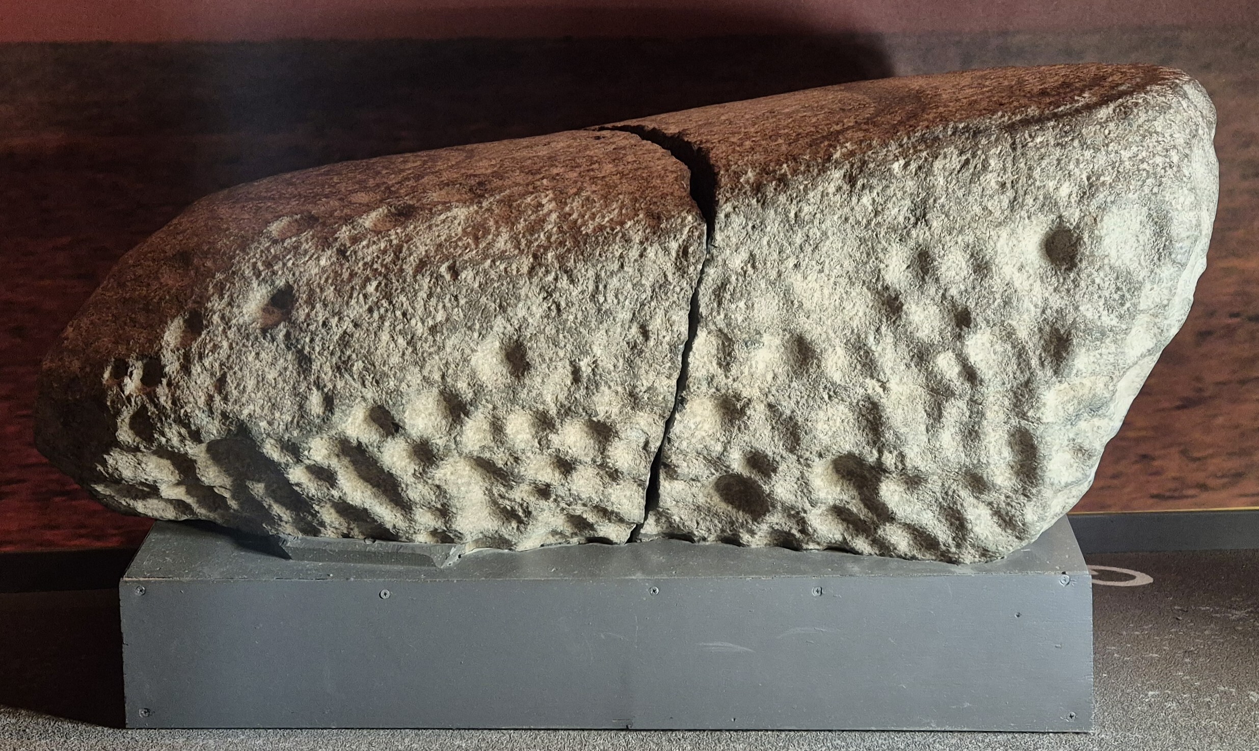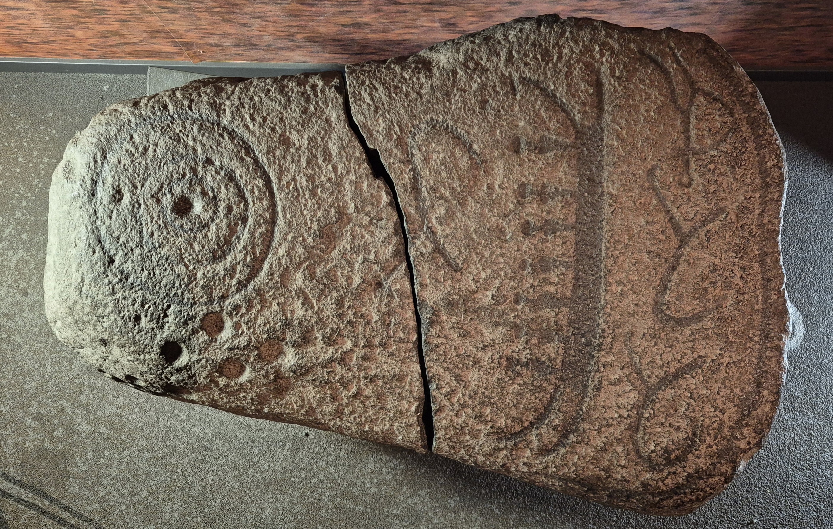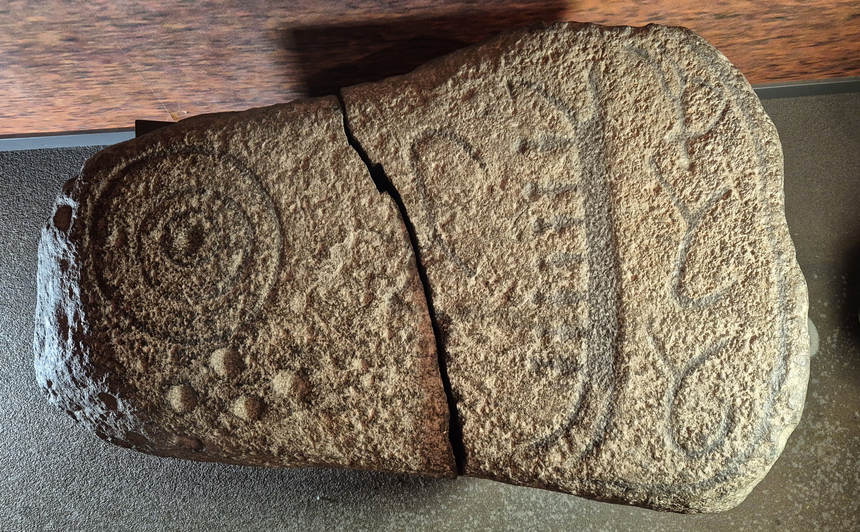 naturligt format stenblock med hällristningar av ett skepp med 7 besättningsmän, en koncentrisk cirkel, ett fyrfota djur ovan skeppet och två fyrfotadjur och en människa? under skeppet. Avslutas nedtill med en ram. Runt hela blocket finns dessutom minst 150 skålgropar. Funnen på tomten till en fastighet norr om ett gravfält. Efter fyndet gjordes en efterundersökning då det påträffades en grav från äldre järnålder?. Osäker koppling mellan hällristningsblocket och eventuell kontext. Blocket har spruckit i två delar någon gång före 2002.