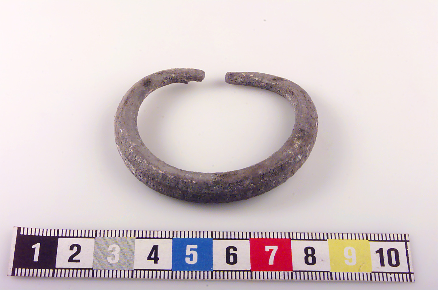 Lätt mångkantig ten med avsmalnande ändar. Skadat ytskikt. Ornerad med motställda trianglar i tre rader.