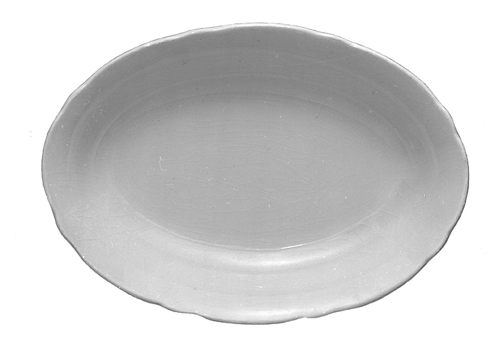 KAROTT av porslin. Oval, skålformig, med något kontuerad utsvängd bräddkant samt på låg fotkant. Stämpel på undersidan. Mått: H: 3,8; L: 20; B: 14,2 cm.