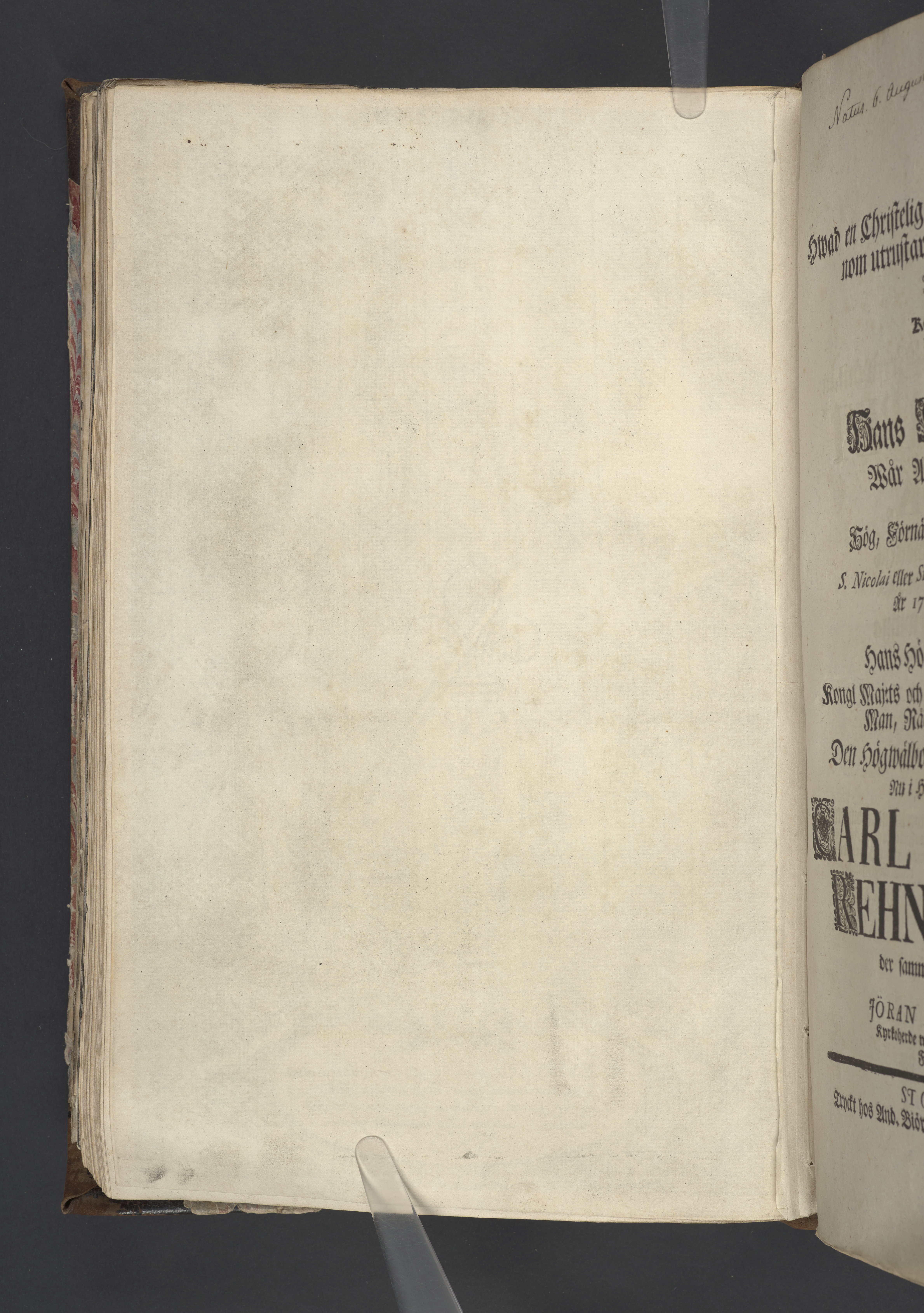 Hwad en christelig soldat är, när Gud honom utrustar, styrcker och hielper: i anledning af konung Davids ord psalm. 18. v. 33-36. förestäldt, närwarande hans kongl. majestet wår allernådigste konung, och en öfrig hög, förnäm och anseenlig församling, uti S. Nicolai eller Stockholms stads stora kyrko, år 1722 den 15 martii, då hans hög-grefl. excell:ce kongl. maj:ts och Swerjes rikes högtbetrodde man, råd och fält marschalk ... nu i herranom salige Carl Gustaf Rehnschöld der sammastädes begrofs: af Jöran A. Nordberg ... Stockholm, tryckt hos And. Biörkman, kongl. acad. boktr. i Åbo.