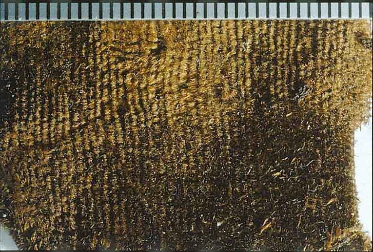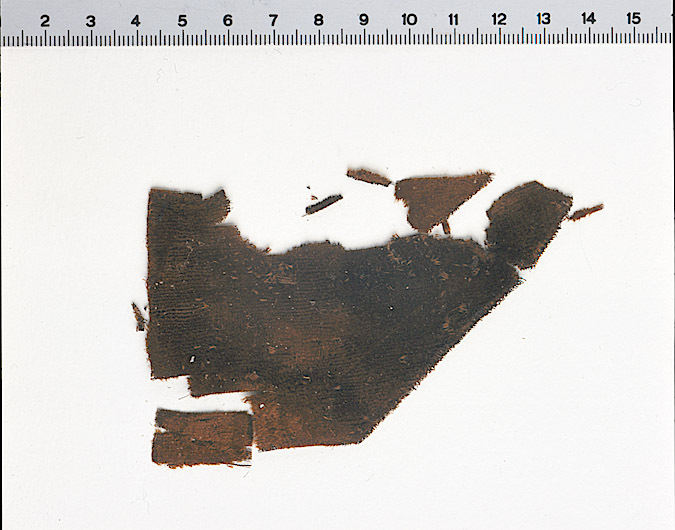 Fragment av sammet i tre delar. Påträffat löst liggande på kudden. Fragmentet ingår i en samling fragment tagna som prov ur drottning Kristinas kista vid gravöppningen den 13-14 december 1965. Varp: Silke med parallellt liggande fibrer, dvs utan snodd.. Trådtäthet: 92 trådar/cm Inslag: Silke med parallellt liggande fibrer, dvs utan snodd. Trådtäthet: 35 trådar/cm Material: Silke Teknik: Sammet. Kommentar: Nuvarande färg är mörkt brun