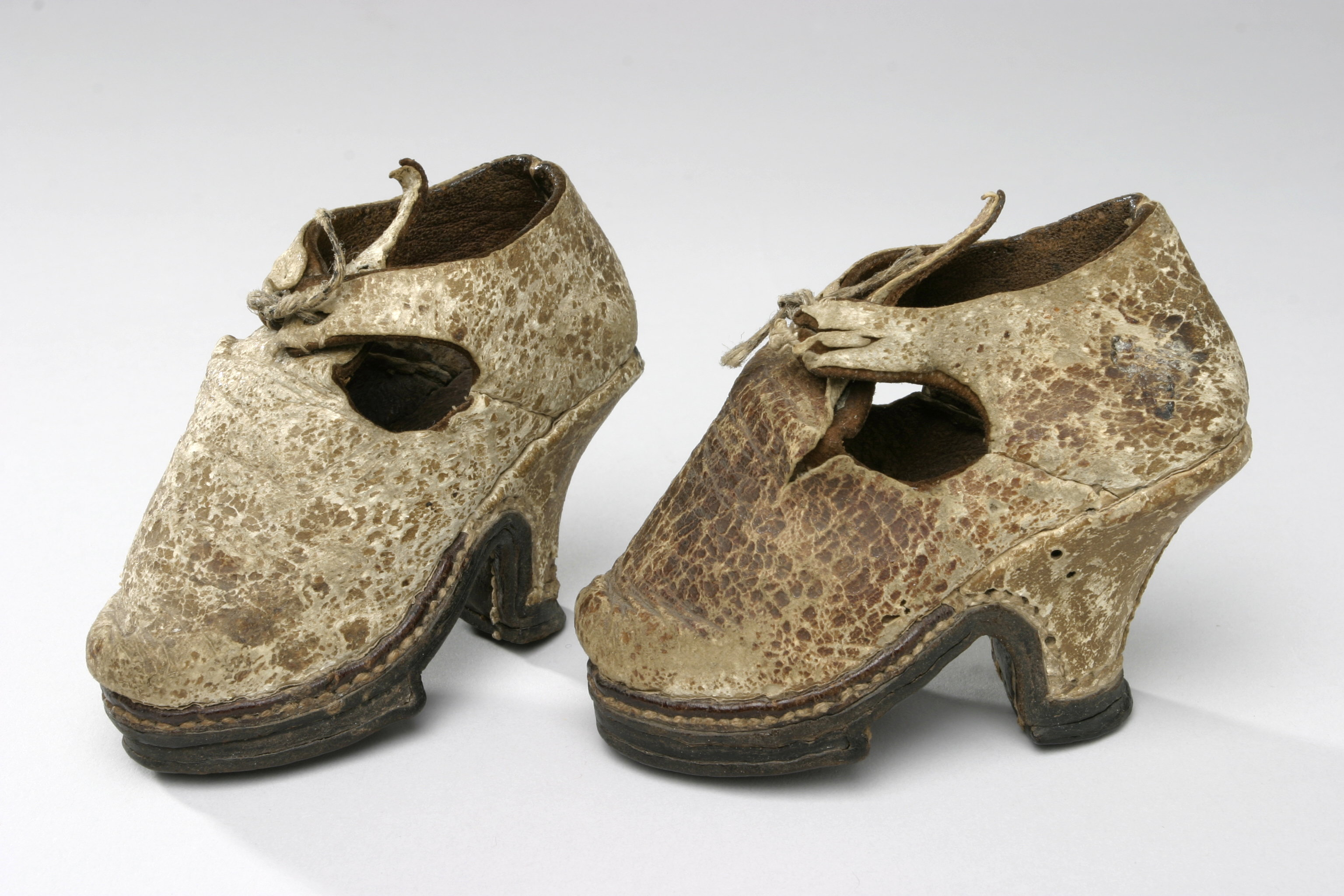 Från Venedig. Sko tillverkad av dubbelt skinn, utvändigt med tunnt, vitt glaceskinn som färgats ockra-brunt, härunder ett tjockare brunt skinn. Skon har rundad tå och med reseft uppdraget i en spetsig plös som har 2 hål för skorosens fästande. Bakstycket är framtill utdraget i en slejf på varje sida, slejfarna har också hål för knytandet. Bak- och sidsömmar är hopspannade från insidan. Sulan är fastsydd med holtrand. Slitsulan är lagd i vinkel under trampet och en extra sula inlagd under fotens främre halva. Slitsulan går under klackens stiftlapp och har ett pinnhål under tramp, hålfot och klack.Klacken som är 50 mm hög och 30 mm bred har rak front. Den är av trä, klädd med skinn och har söm mitt bak.