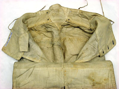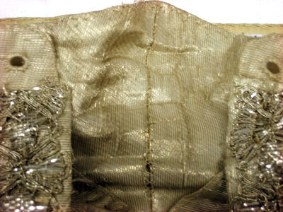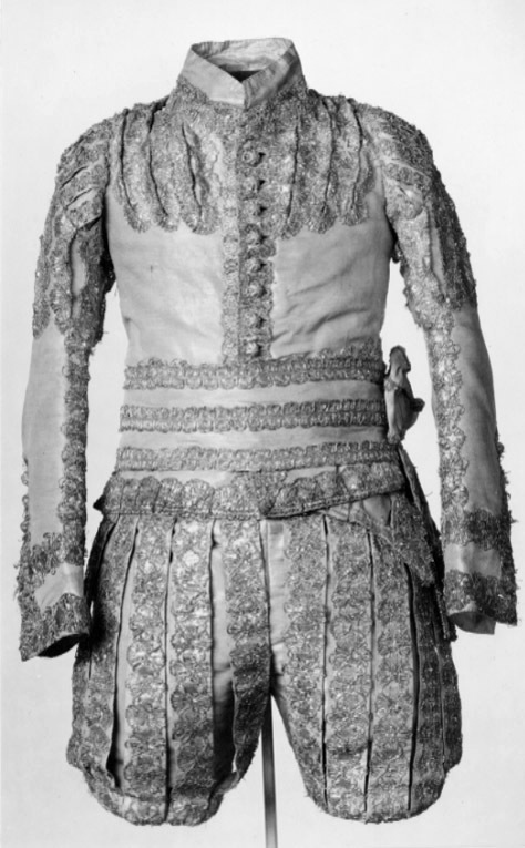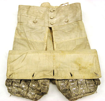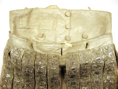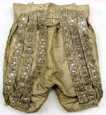 Byxor av ripsvävt silvertyg där framsidan är försedd med fem stycken slitsar, 31 mm breda och 390 mm långa, på vardera byxbenet. På baksidan finns tre stycken slitsar på vardera byxbenet. Alla slitsar är dekorerade med silverspets. Nertill på varje byxbens utsida är ett 50 mm långt sprund. Framtill en byxklaff (375 mm bred och 170 mm djup) med fem knapphål som är 25 mm breda. Midjebandets bredd är 95 mm framtill och 55 mm bred baktill. Bak på midjebandet är en stolpficka, 100 mm, 28 mm hög och 110 mm djup, placerad. Tre knappar beklädda med samma tyg som byxorna samt fyra knappar till klaffen finns på midjebandet. Foder av atlassiden.